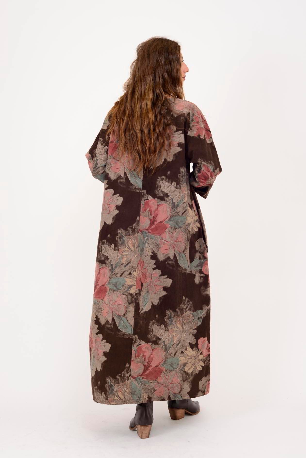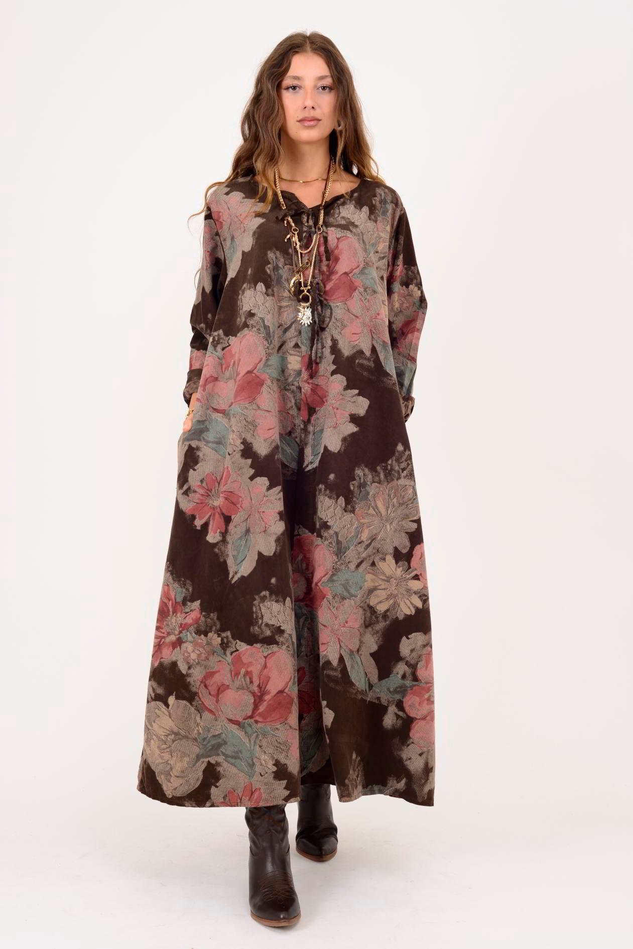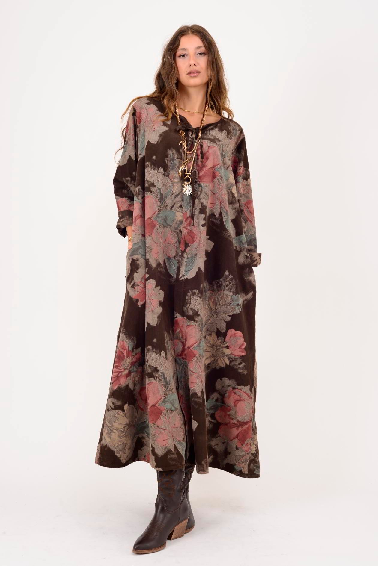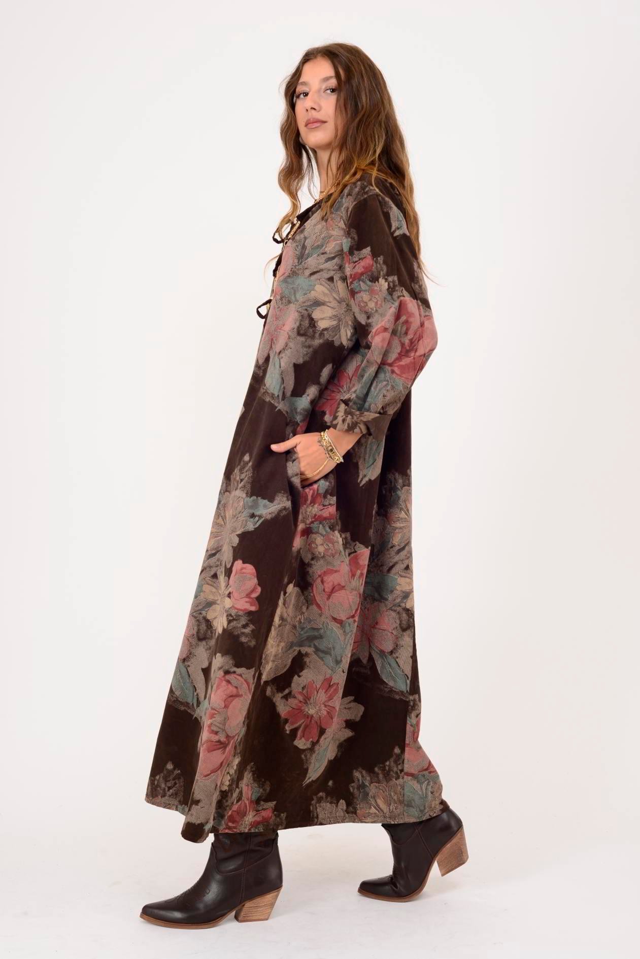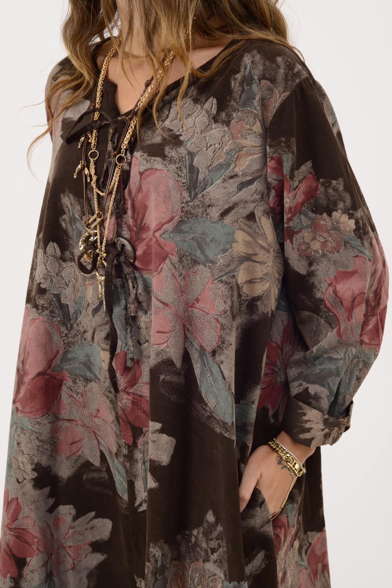 11411 LOVA ÇİÇEK DESEN DÜĞME DETAYLI FİTİLLİ KADİFE ELBİSE (25K.T.ELB.00029-005)