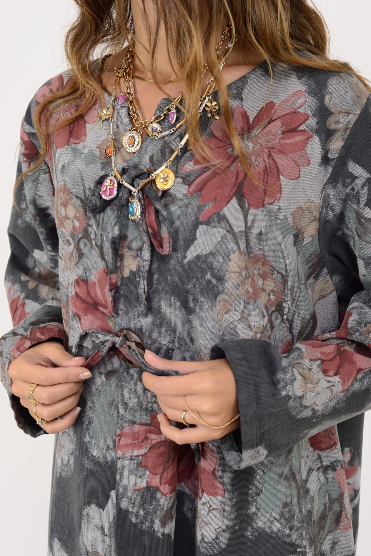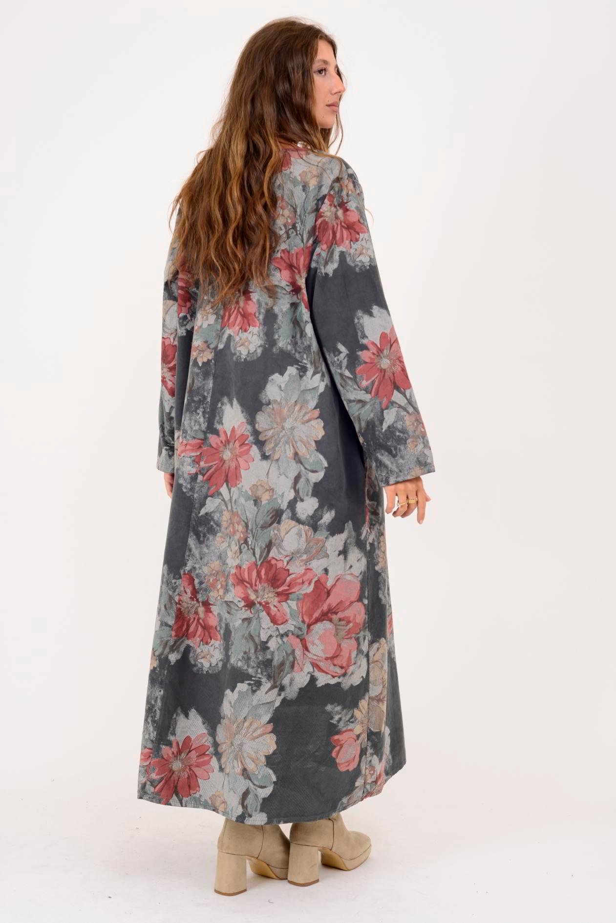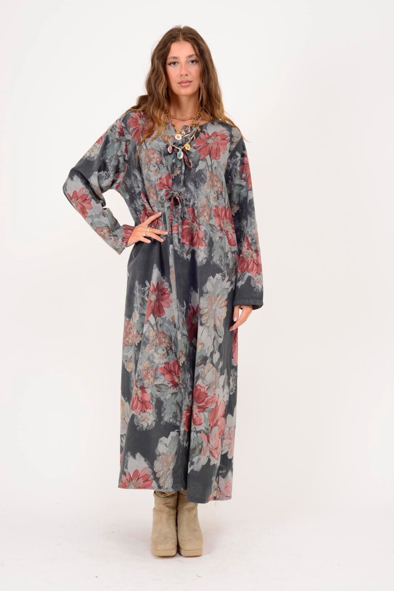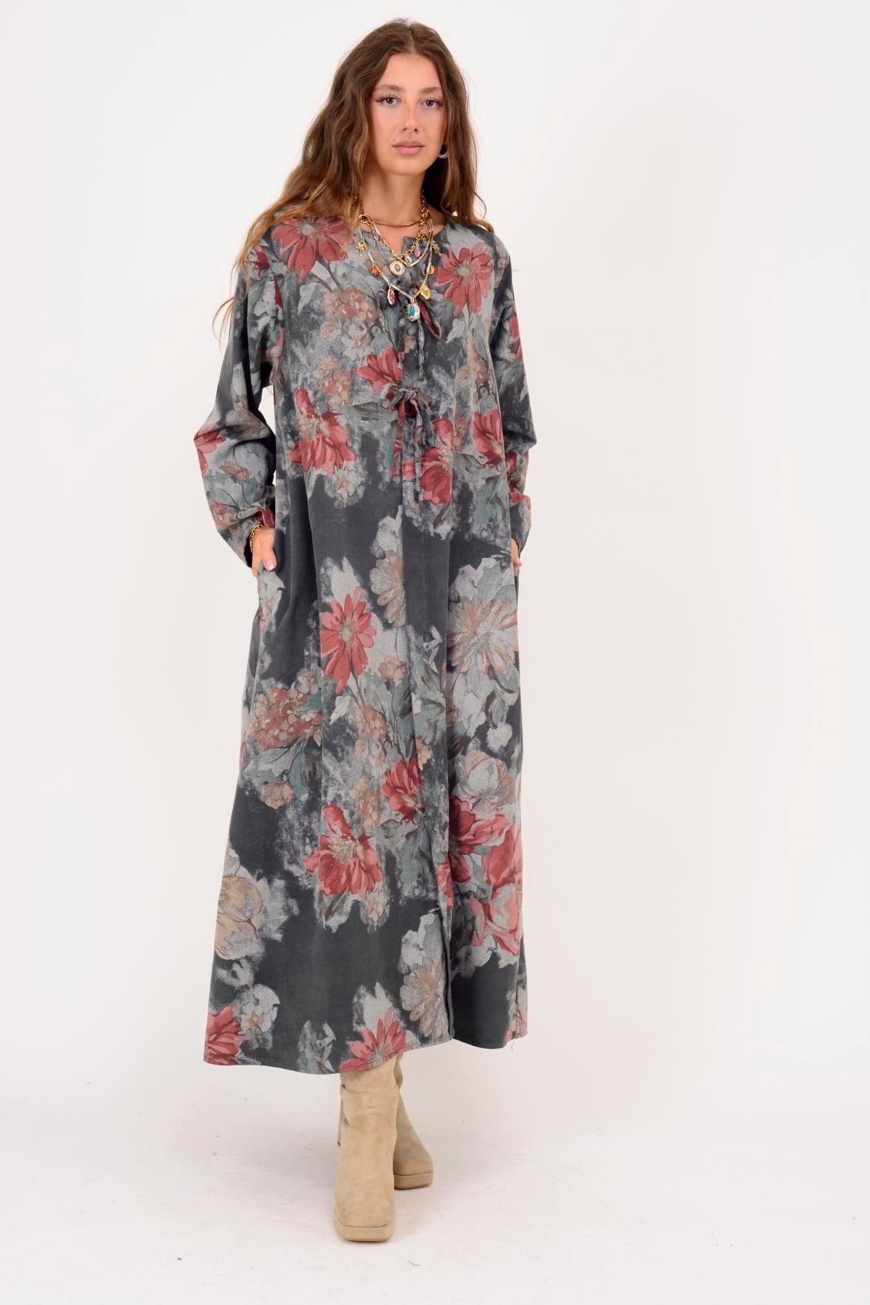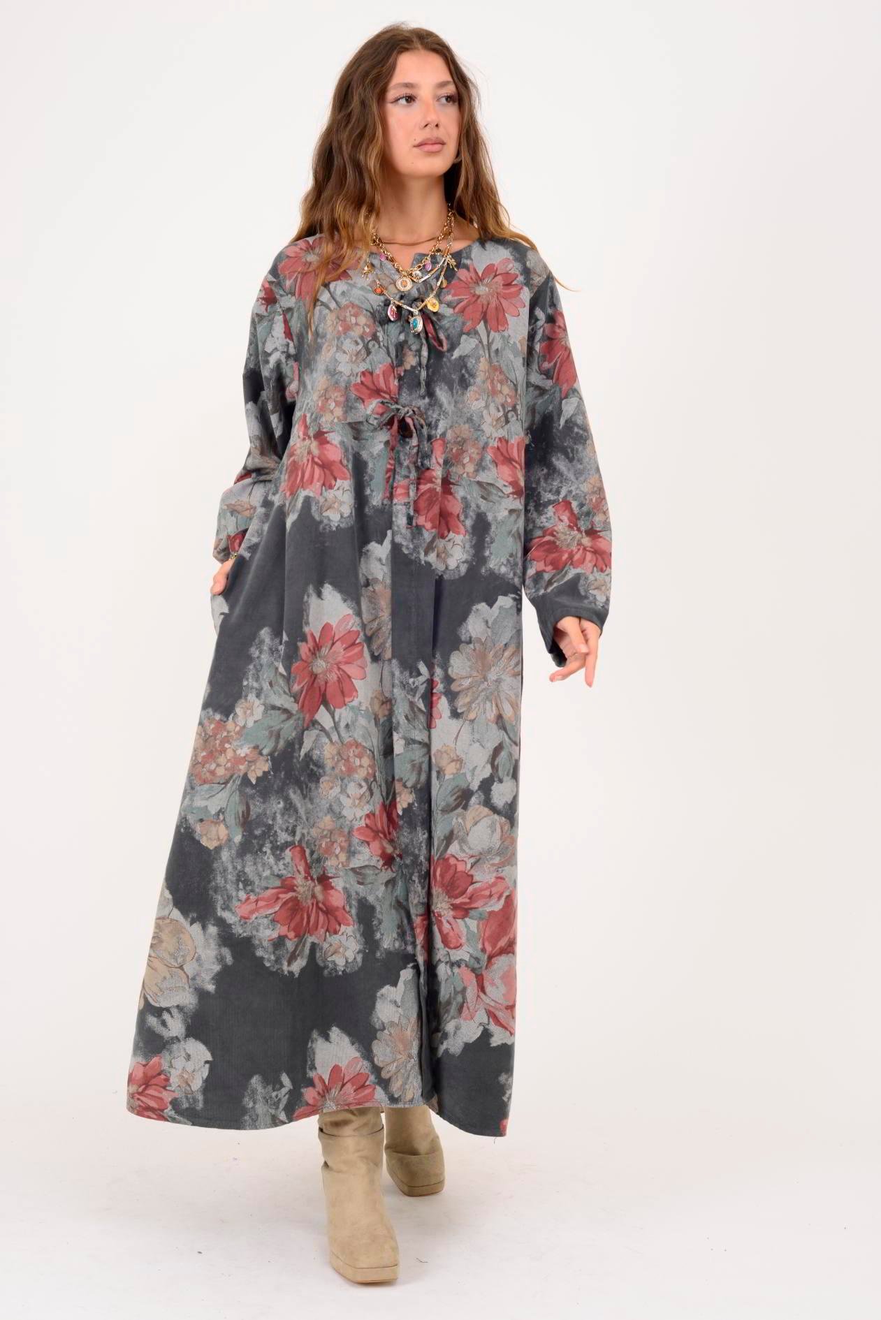 11411 LOVA ÇİÇEK DESEN DÜĞME DETAYLI FİTİLLİ KADİFE ELBİSE (25K.T.ELB.00029-011)