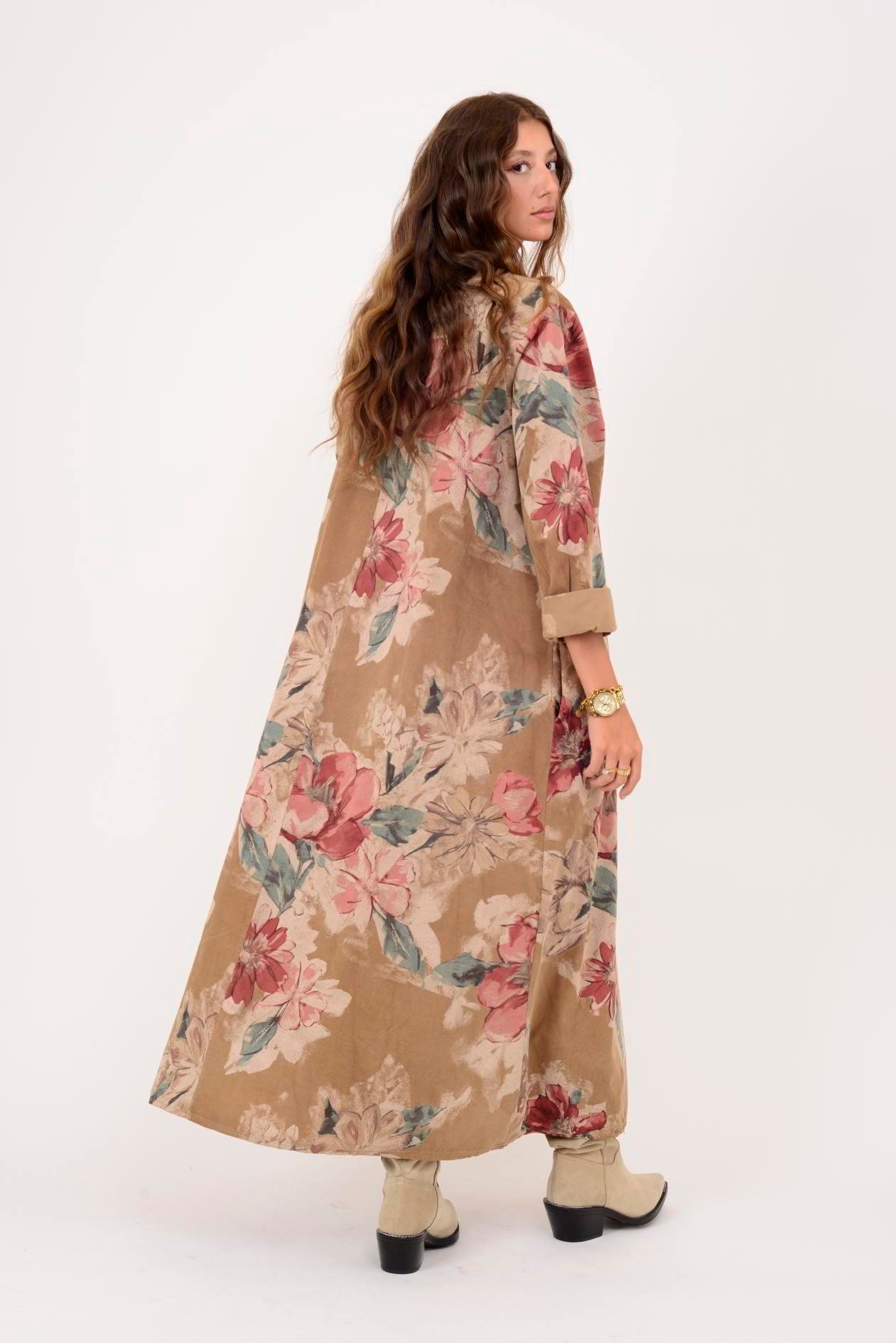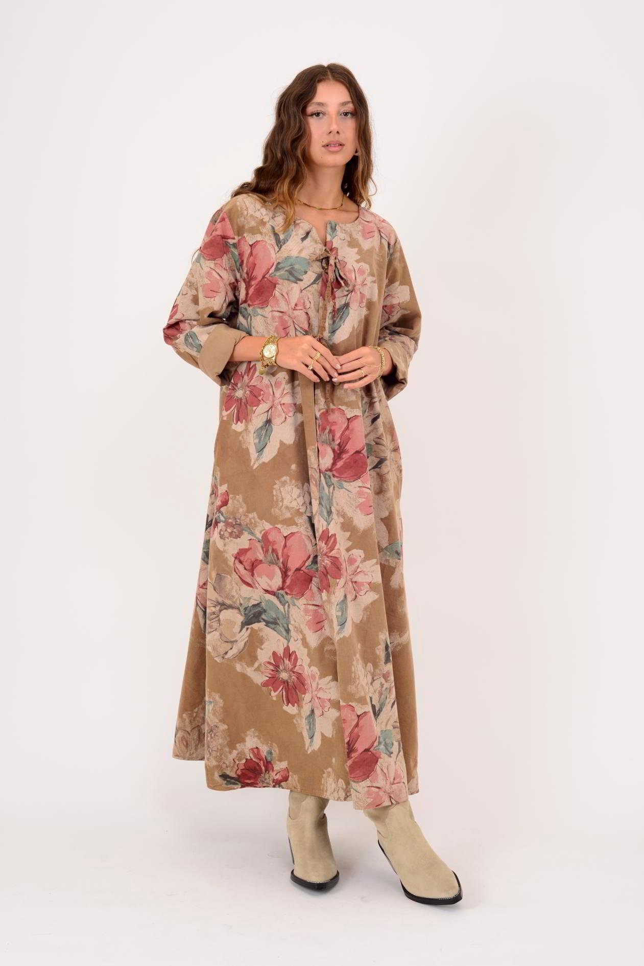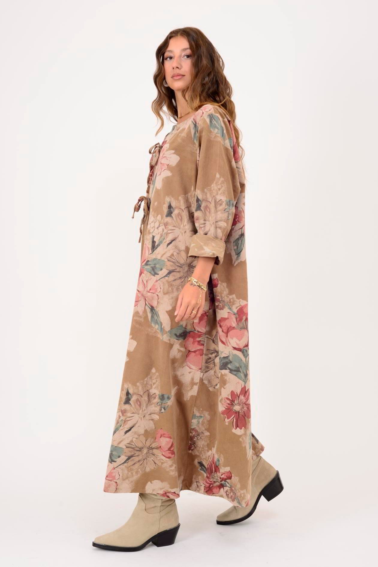 11411 LOVA ÇİÇEK DESEN DÜĞME DETAYLI FİTİLLİ KADİFE ELBİSE (25K.T.ELB.00029-CAP)