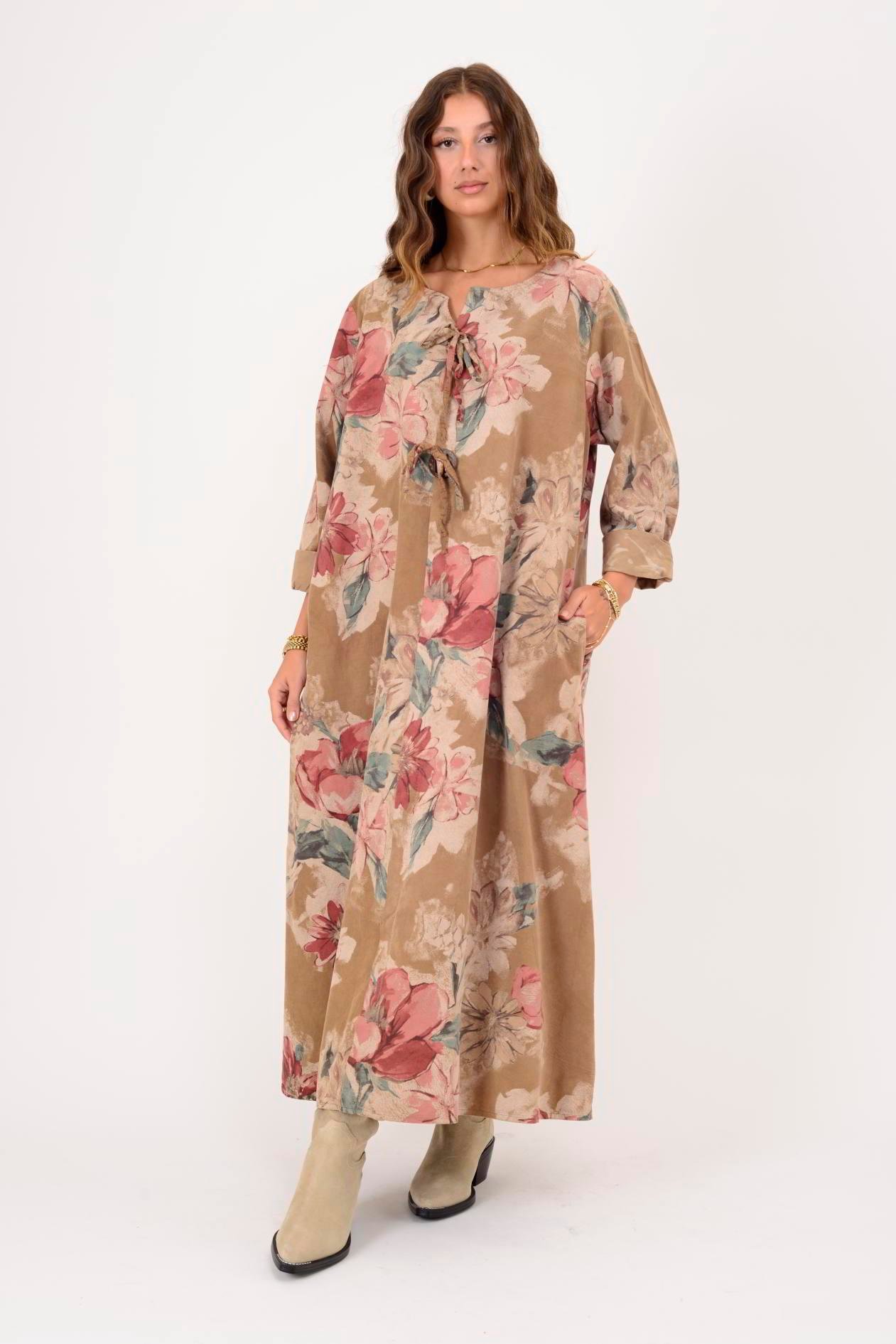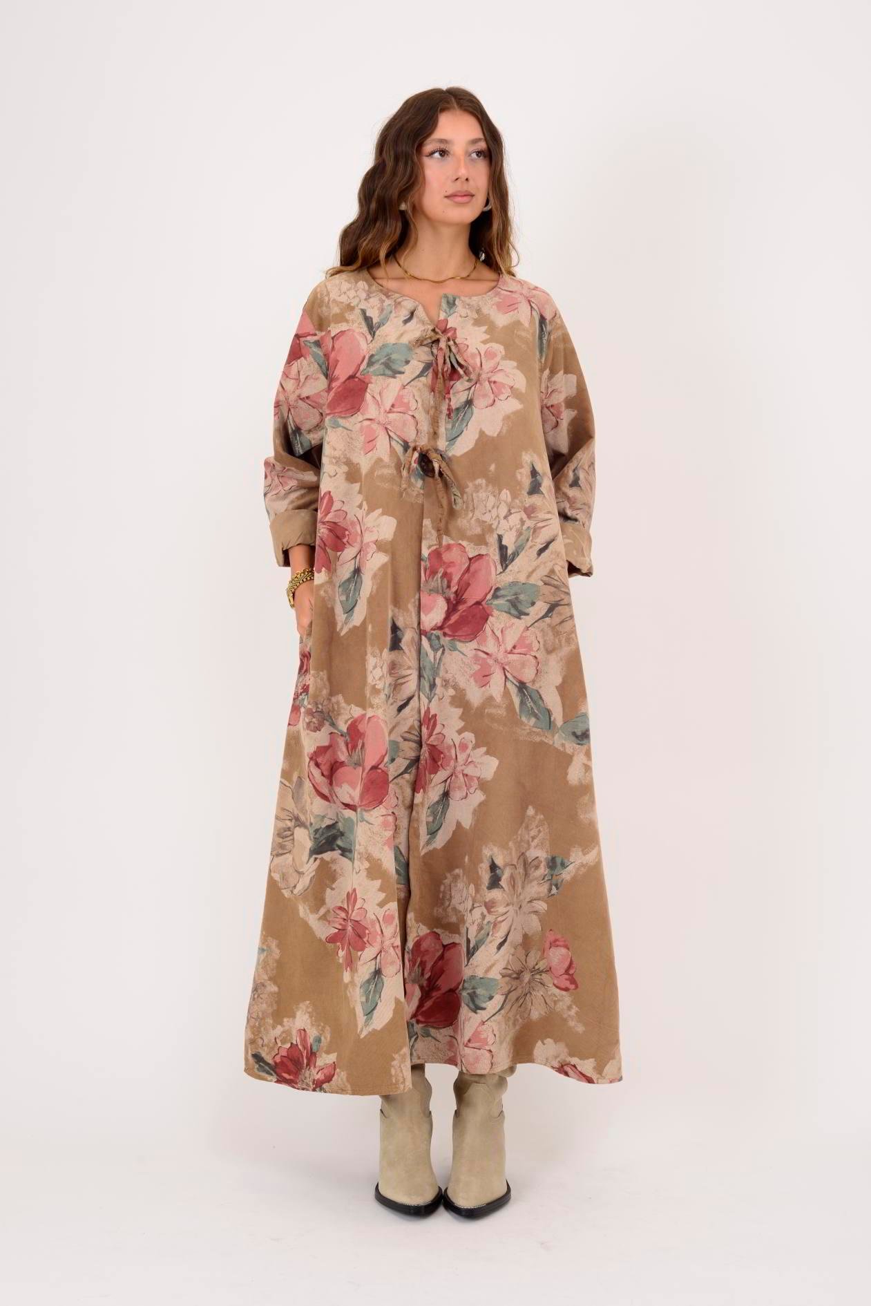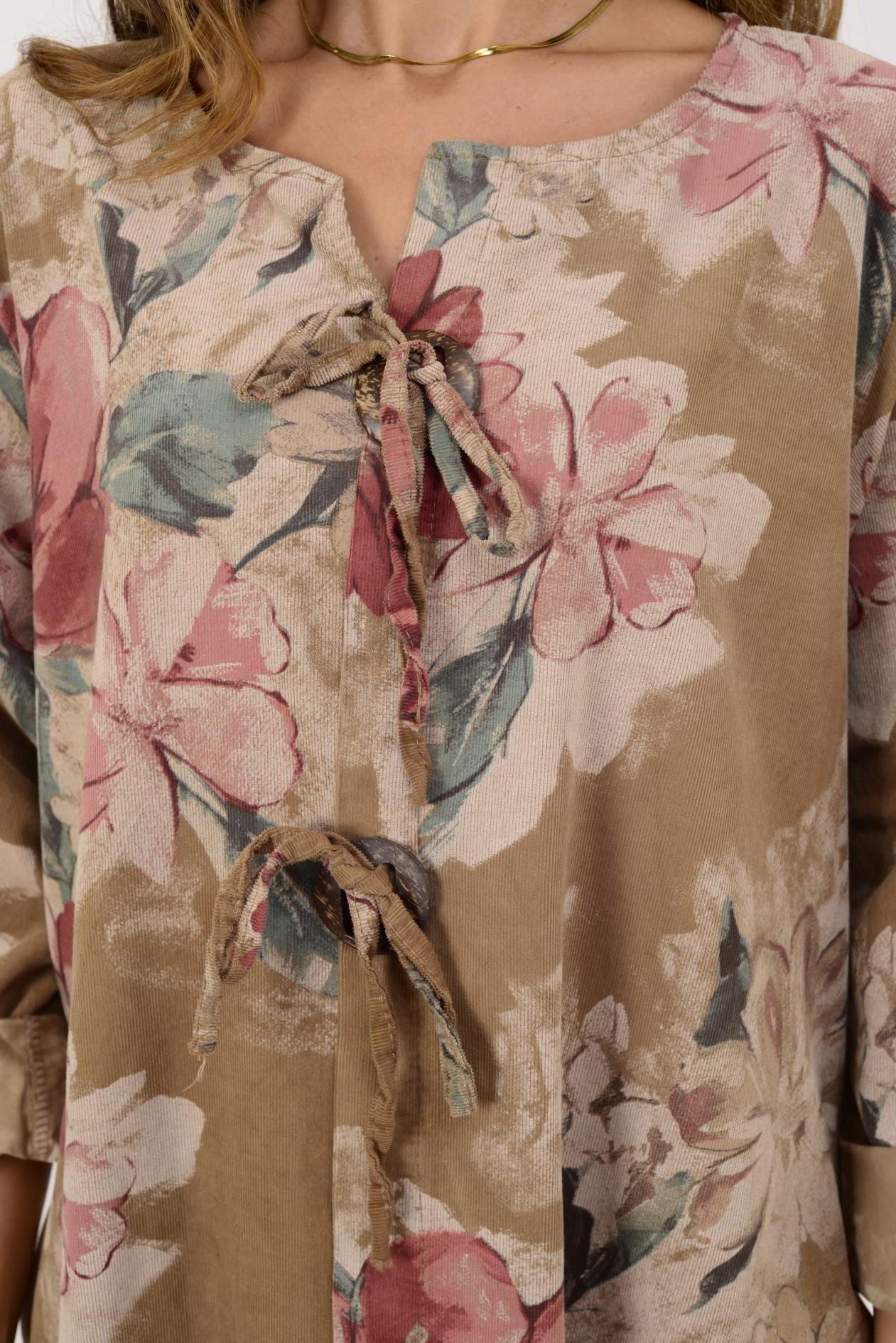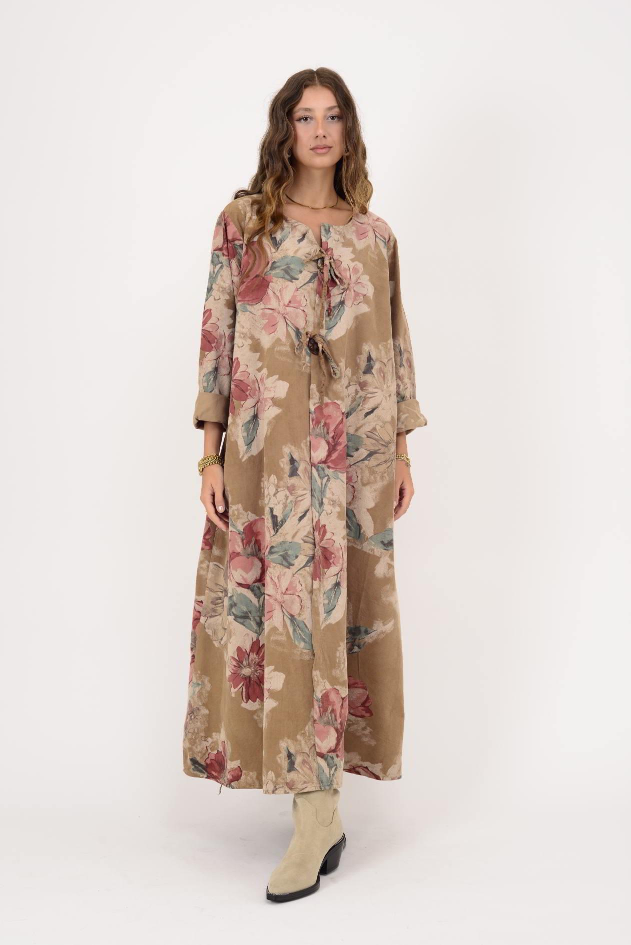 11411 LOVA ÇİÇEK DESEN DÜĞME DETAYLI FİTİLLİ KADİFE ELBİSE (25K.T.ELB.00029-CAP)