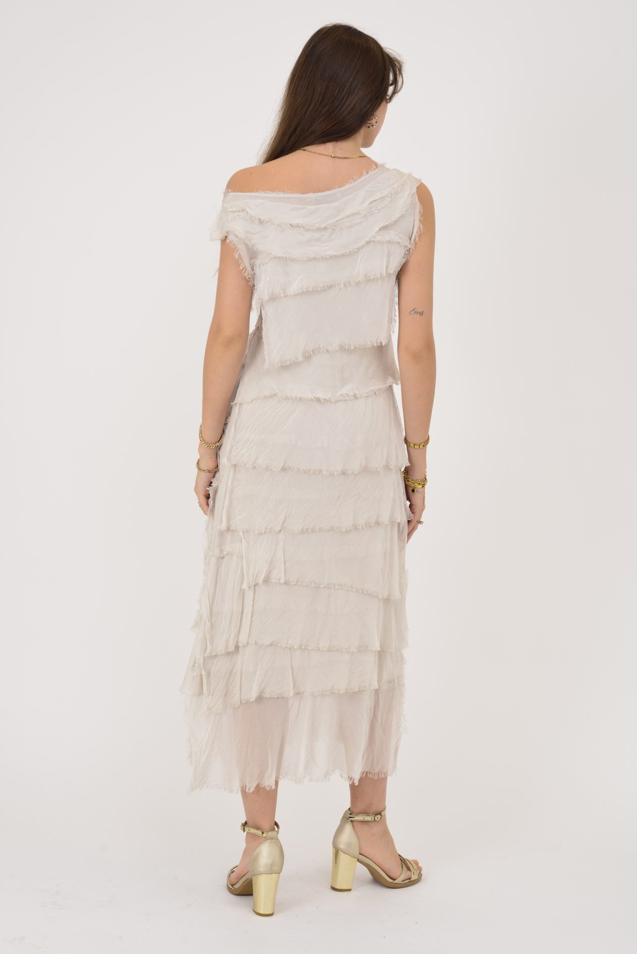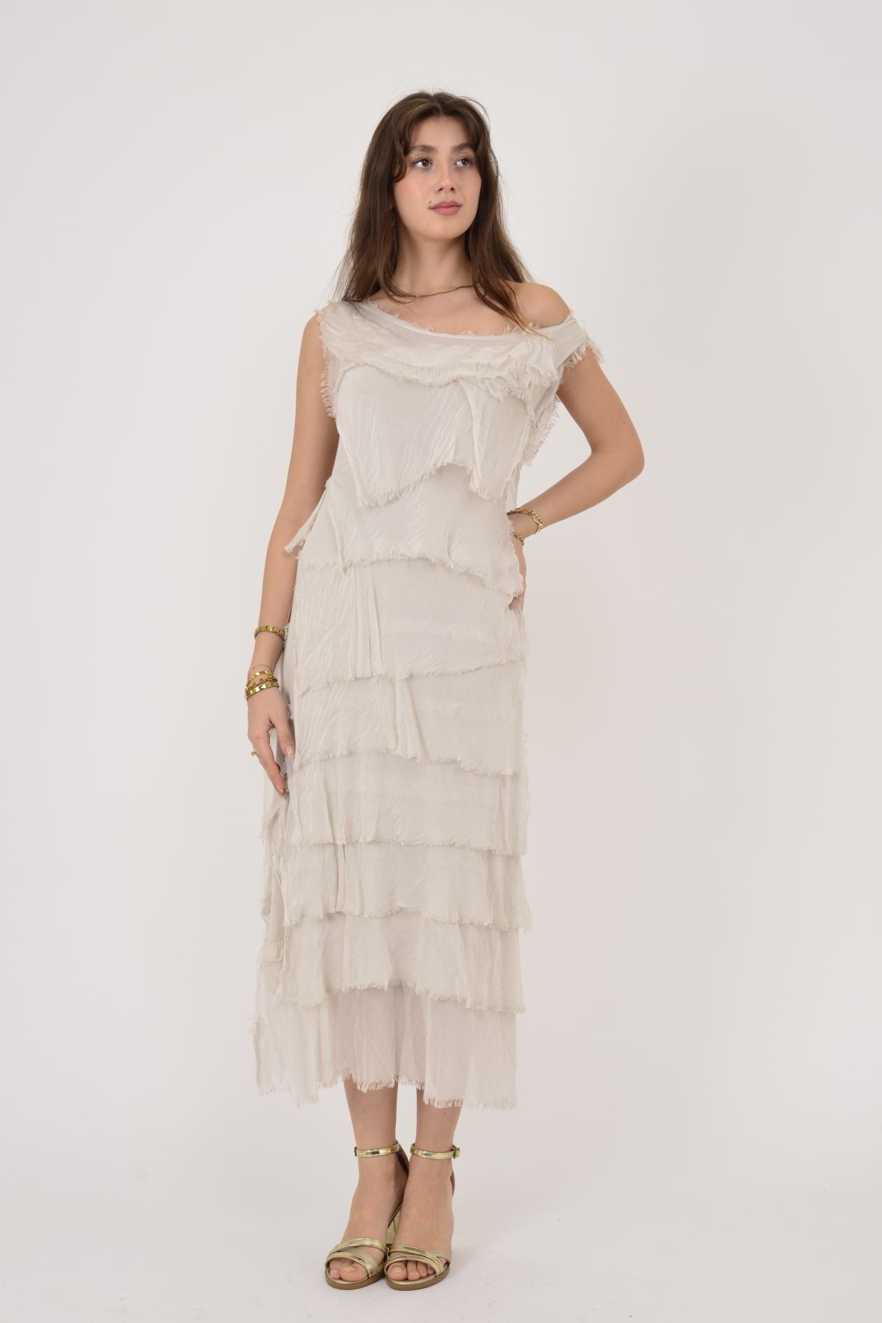 Kat kat tasarımı ve hafif ipeksi dokusuyla öne çıkan bu elbise, zarif ve dikkat çekici bir siluet sunar. Tek omuz görünümü veren formu, hareketli kat detaylarıyla birleşerek feminen ve modern bir duruş kazandırır. Akışkan yapısı sayesinde yürüdükçe canlılık kazanır, özel davetlerden yaz akşamlarına kadar farklı ortamlarda şıklıkla kullanılabilir.