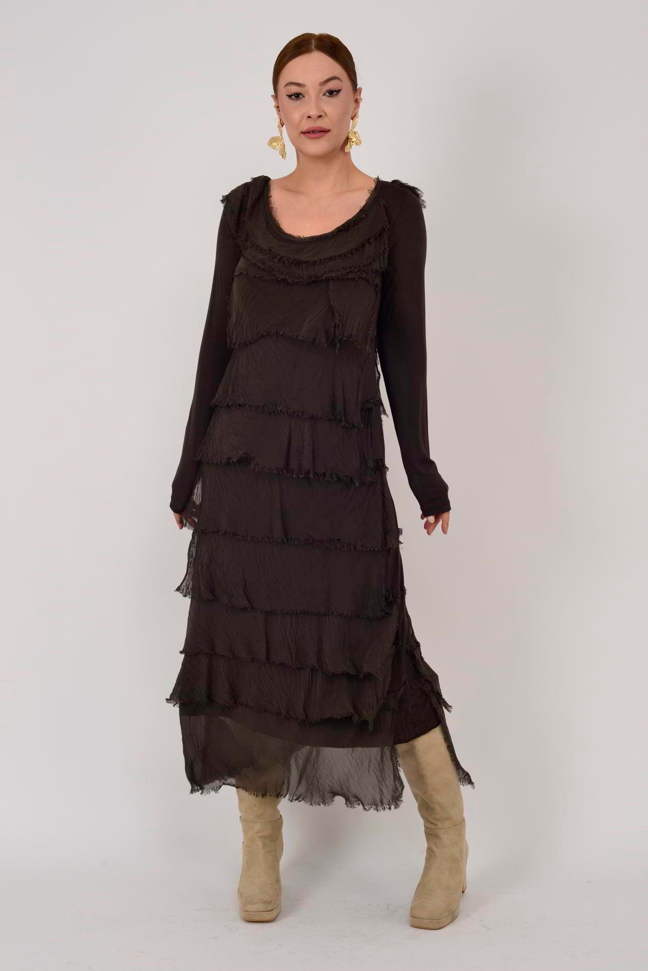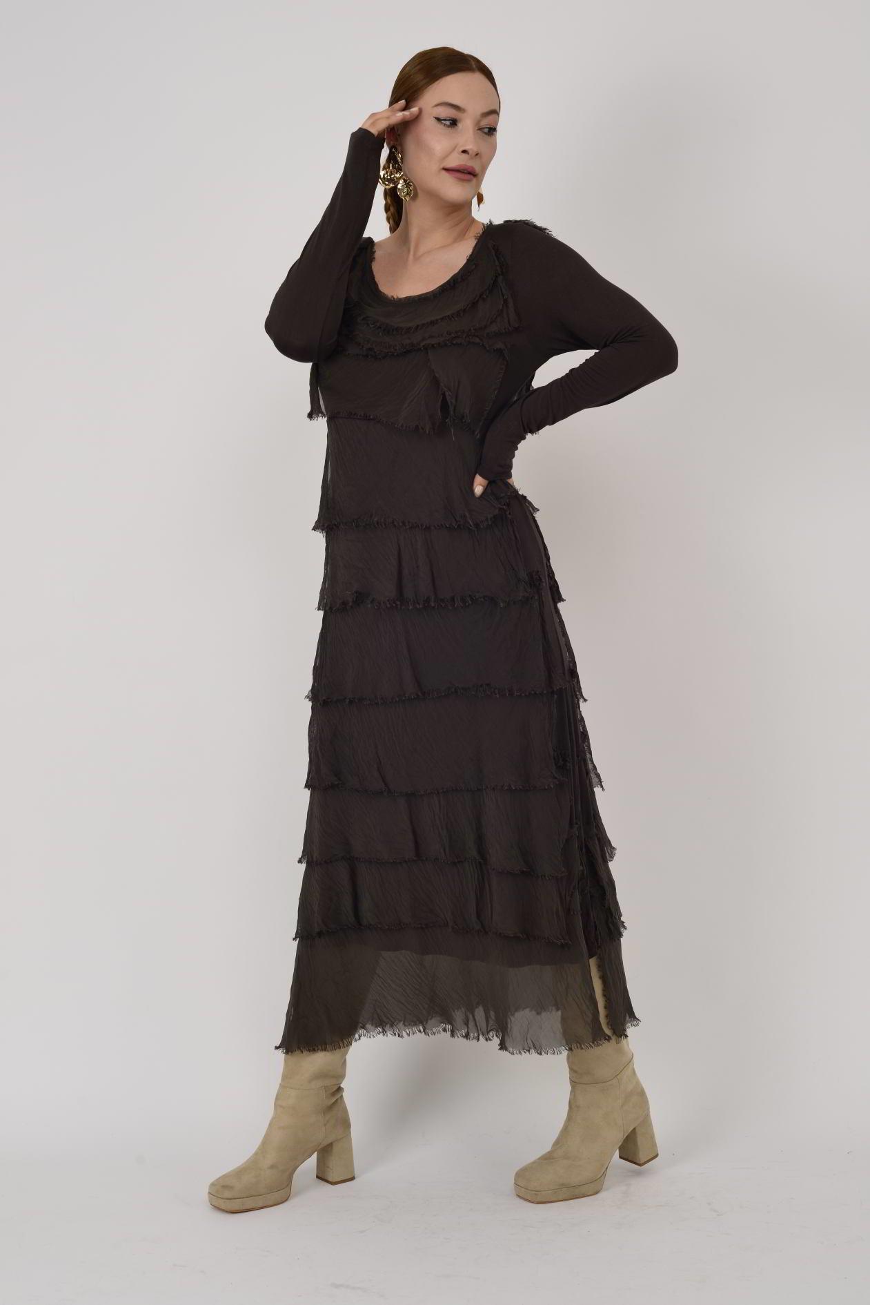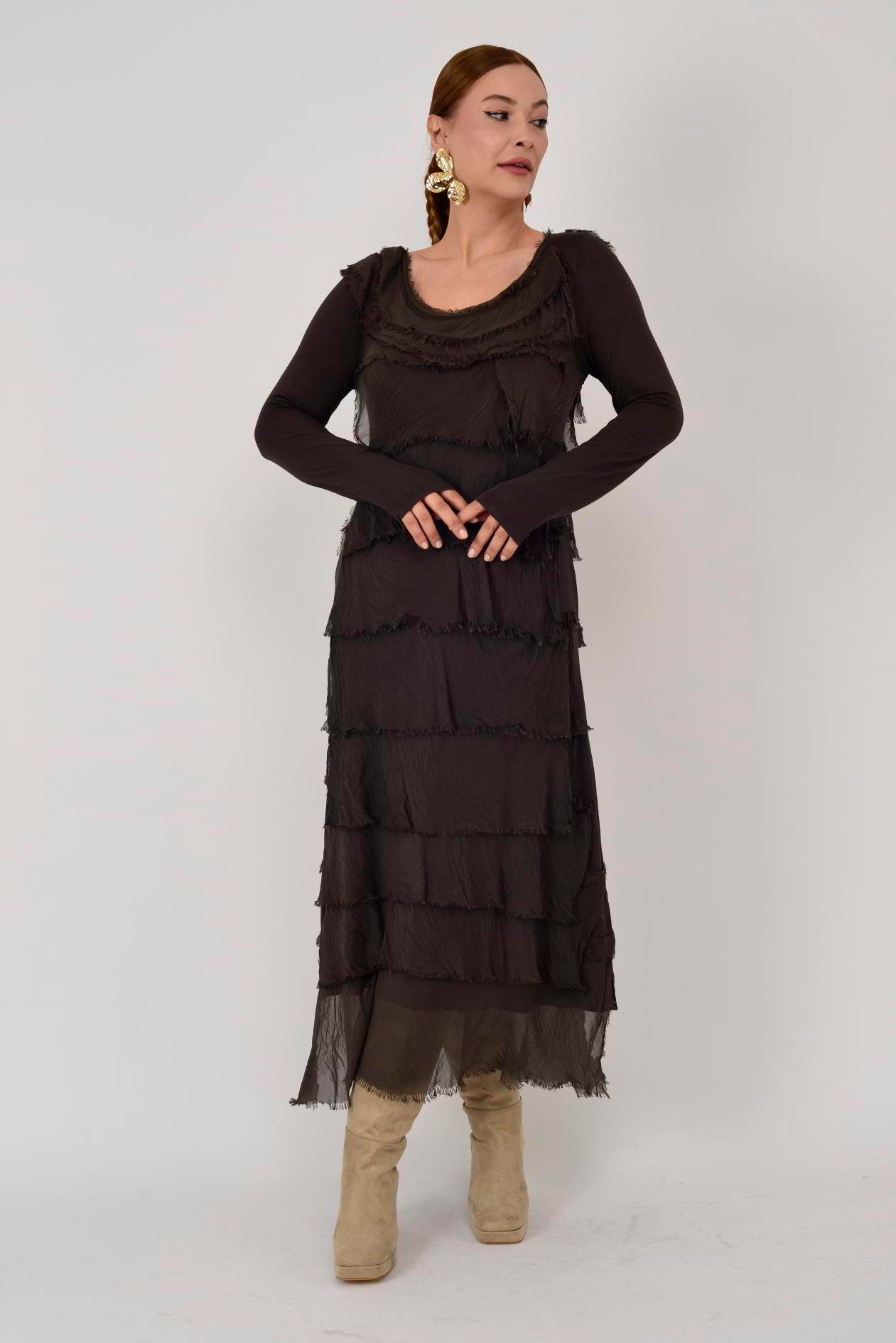 2078 UZUN KOLLU KAT KAT İPEK ELBİSE (17Y.T.ELB.0078-005)
