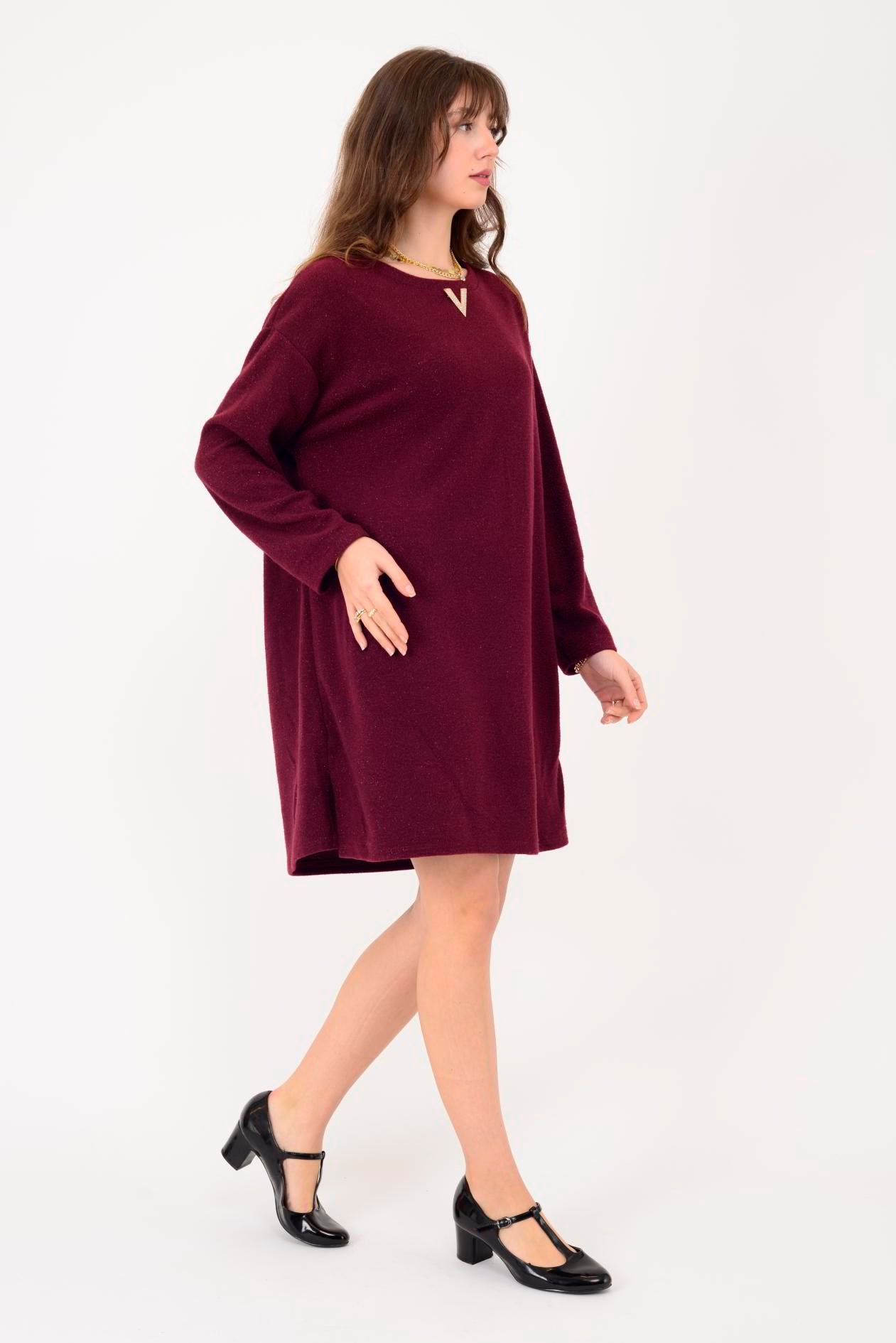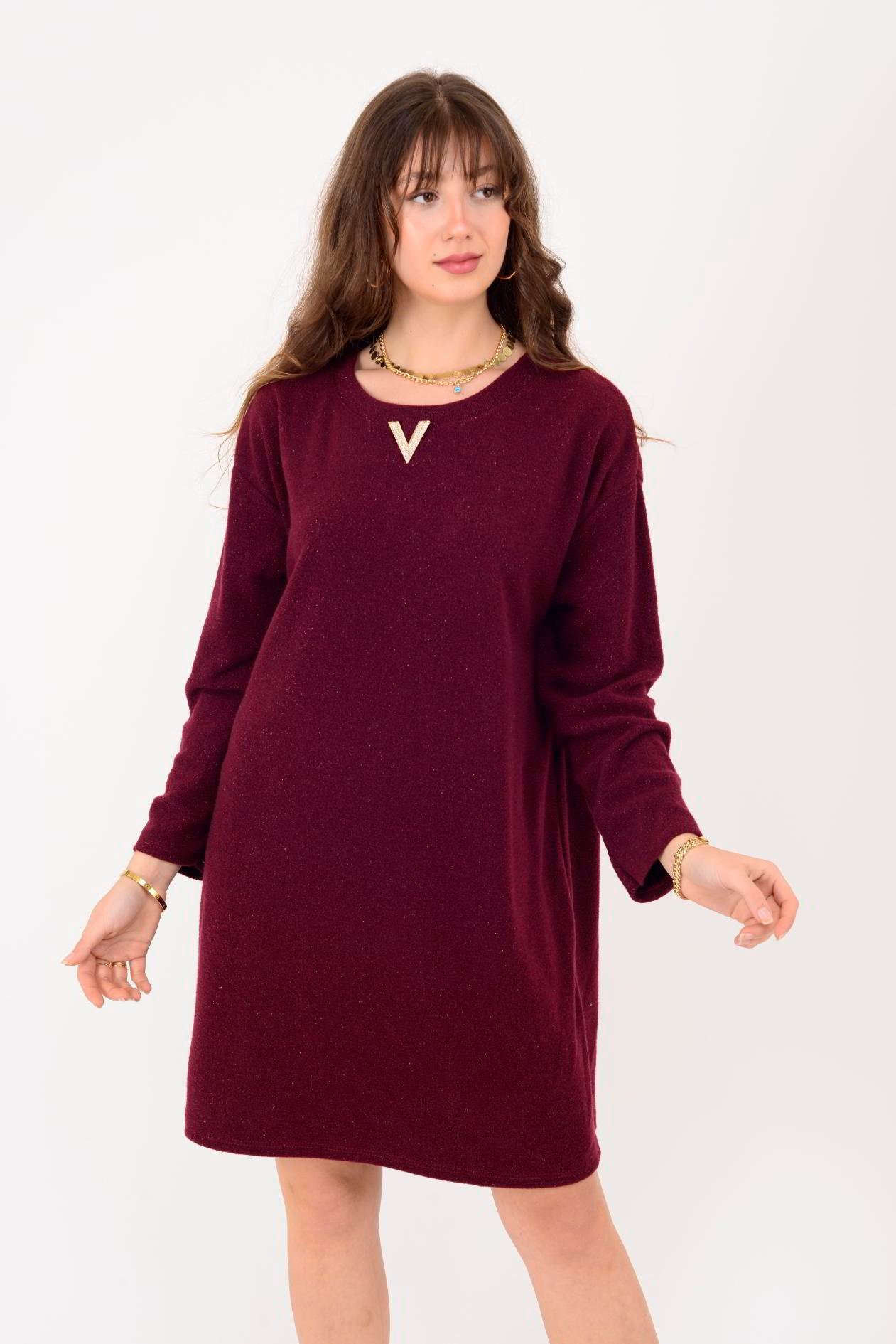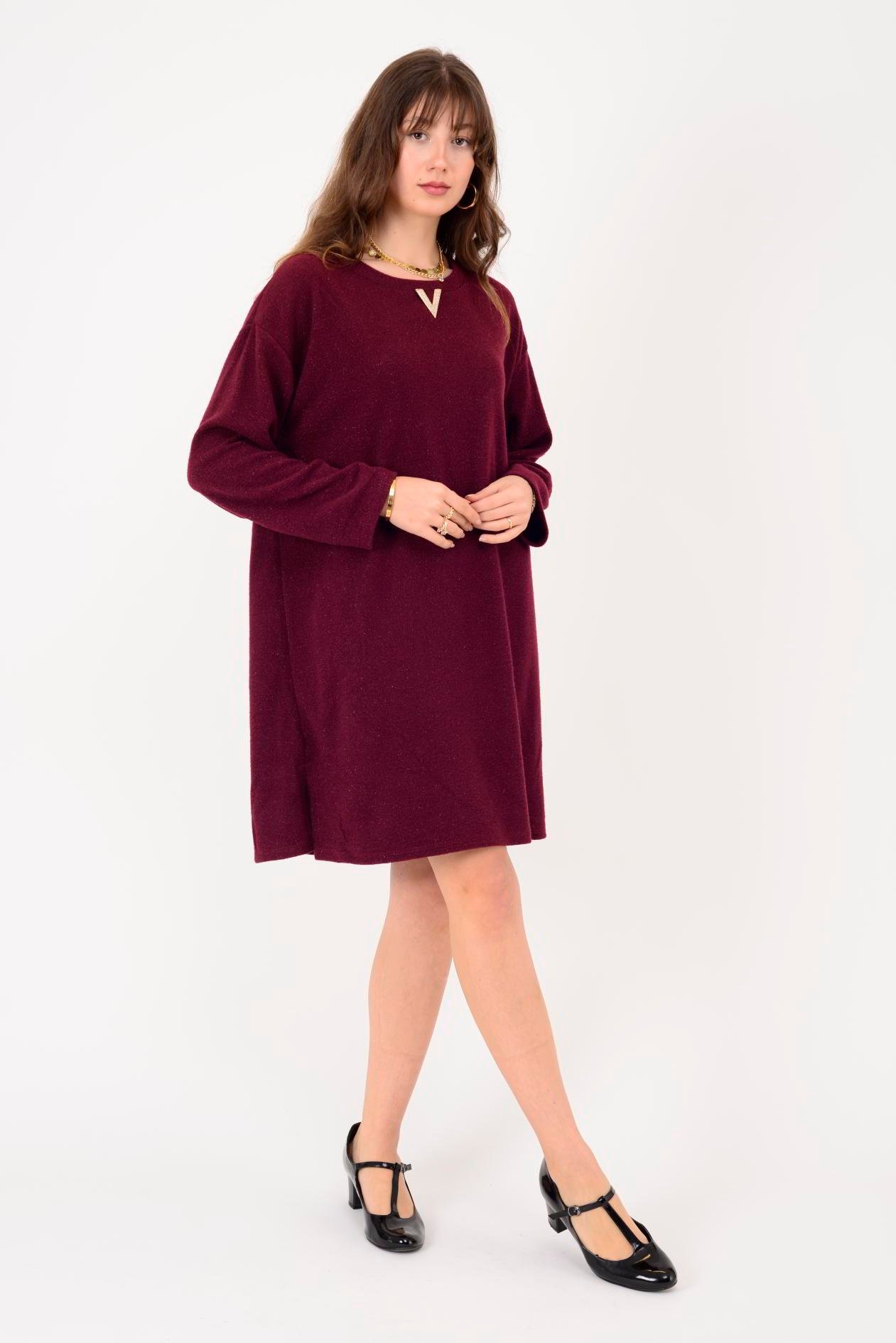 21458 V BROŞ DETAYLI SİMLİ TRİKO DOKULU KISA ELBİSE (25K.T.ELB.00079-018)