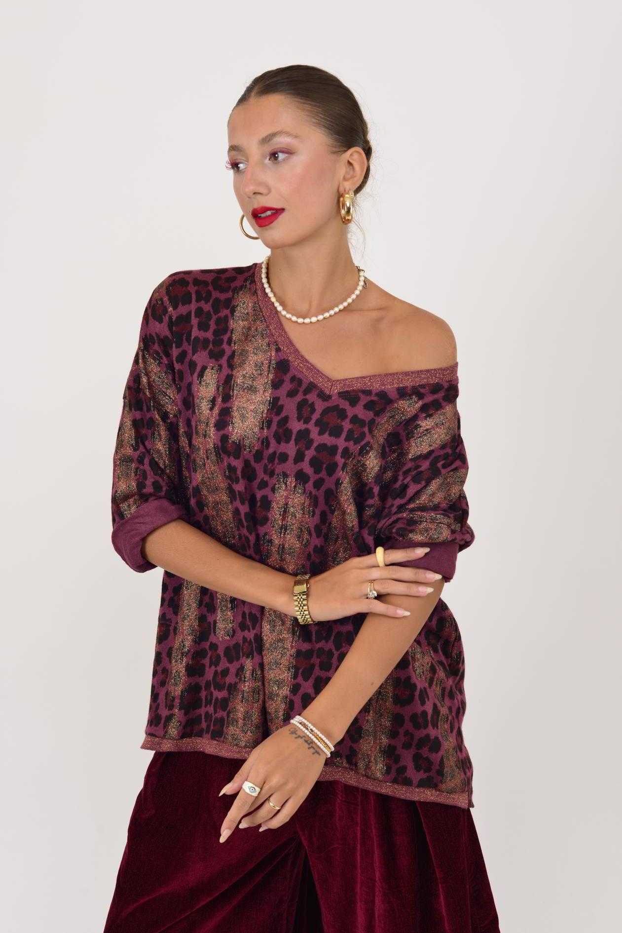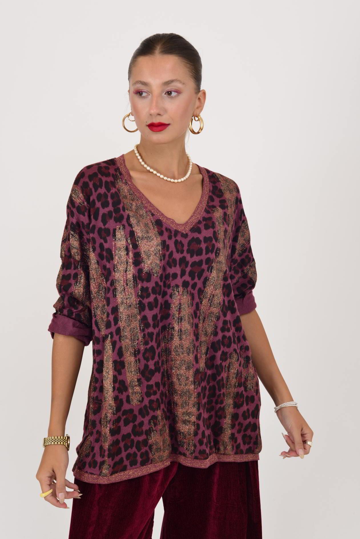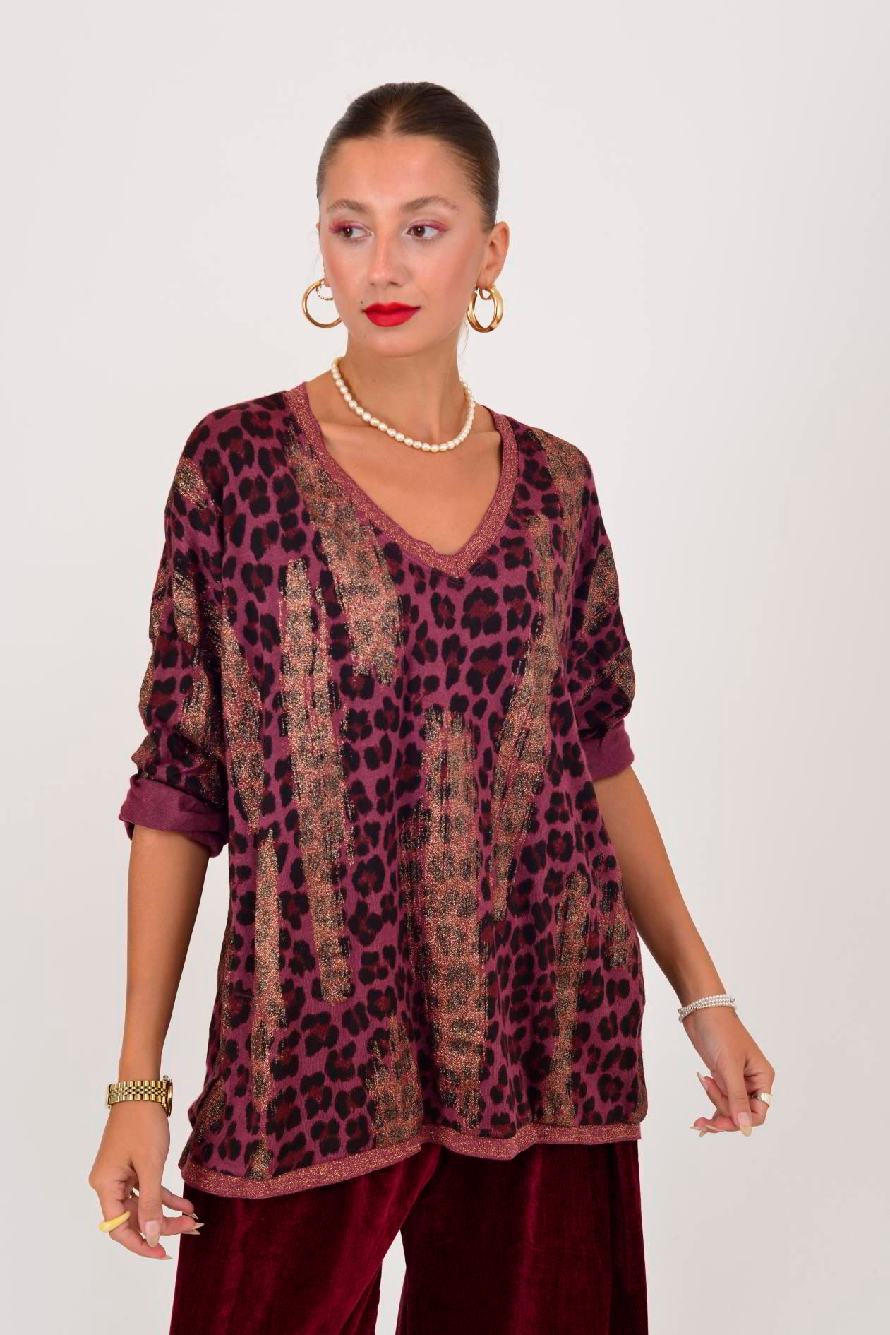 21812 LEOPAR DESENLİ V YAKA YALDIZLI TRİKO (25K.T.BLZ.00181-018)
