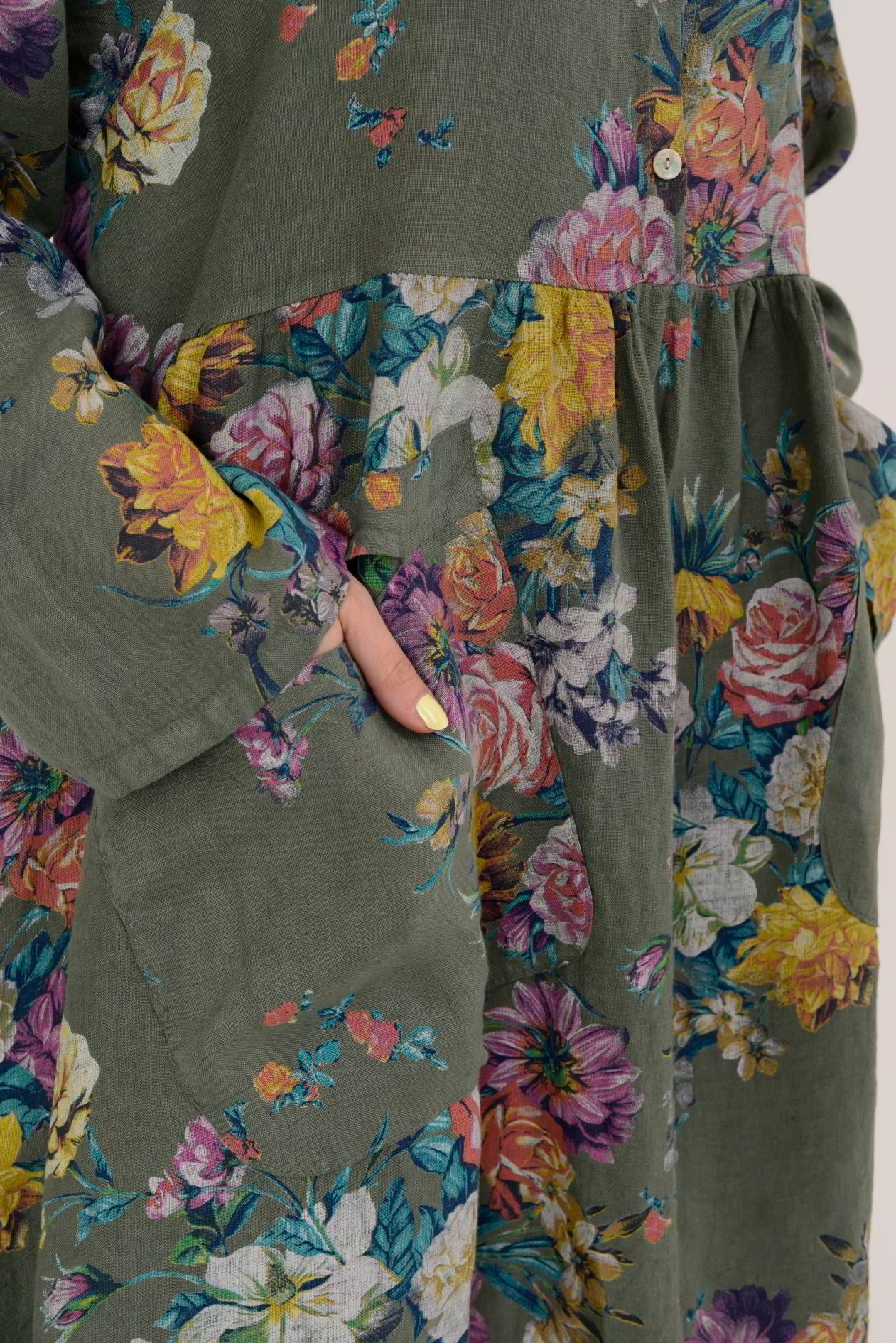23-10 LOVA SPRING ÇİÇEK DESENLİ ÜÇ DÜĞMELİ KETEN ELBİSE (26Y.T.ELB.00062-020)