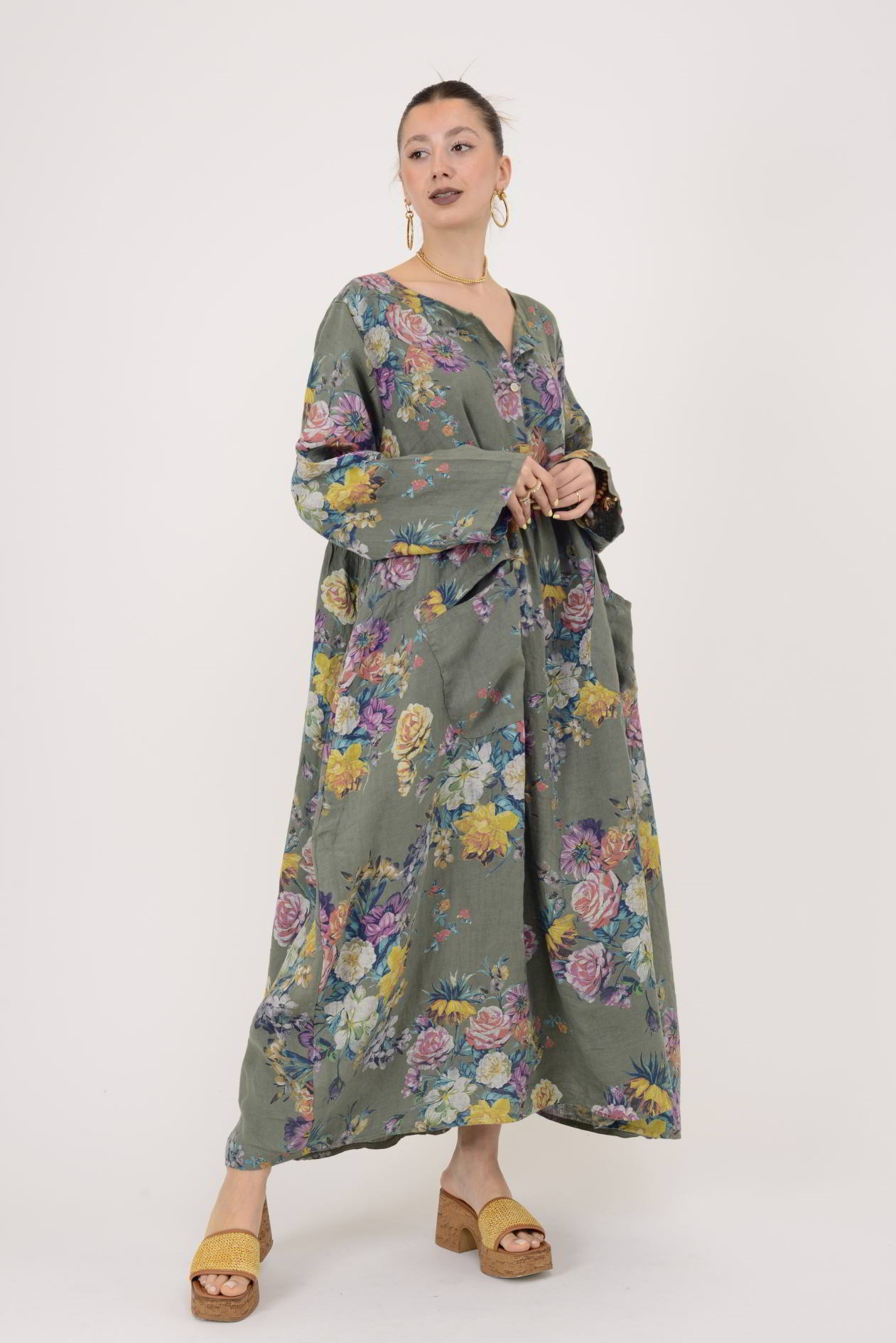 Çiçek desenli bu üç düğmeli keten elbise, hafif ve rahat yapısıyla gün boyu konfor sunar. Göğüs altından inen bol formu ve dökümlü kesimi sayesinde vücudu sarmadan geniş ve rahat bir duruş sağlar. Üç düğmeli detayı modele sade bir hareket katarken, uzun formu şık ve zarif bir görünüm oluşturur.