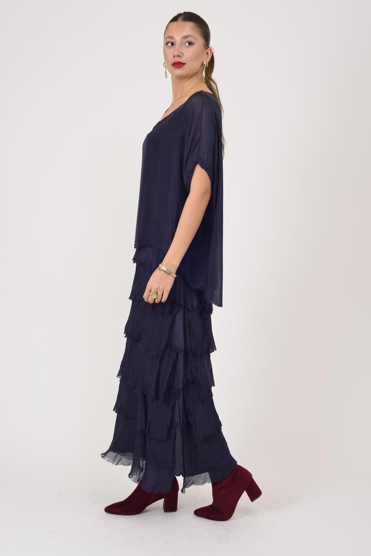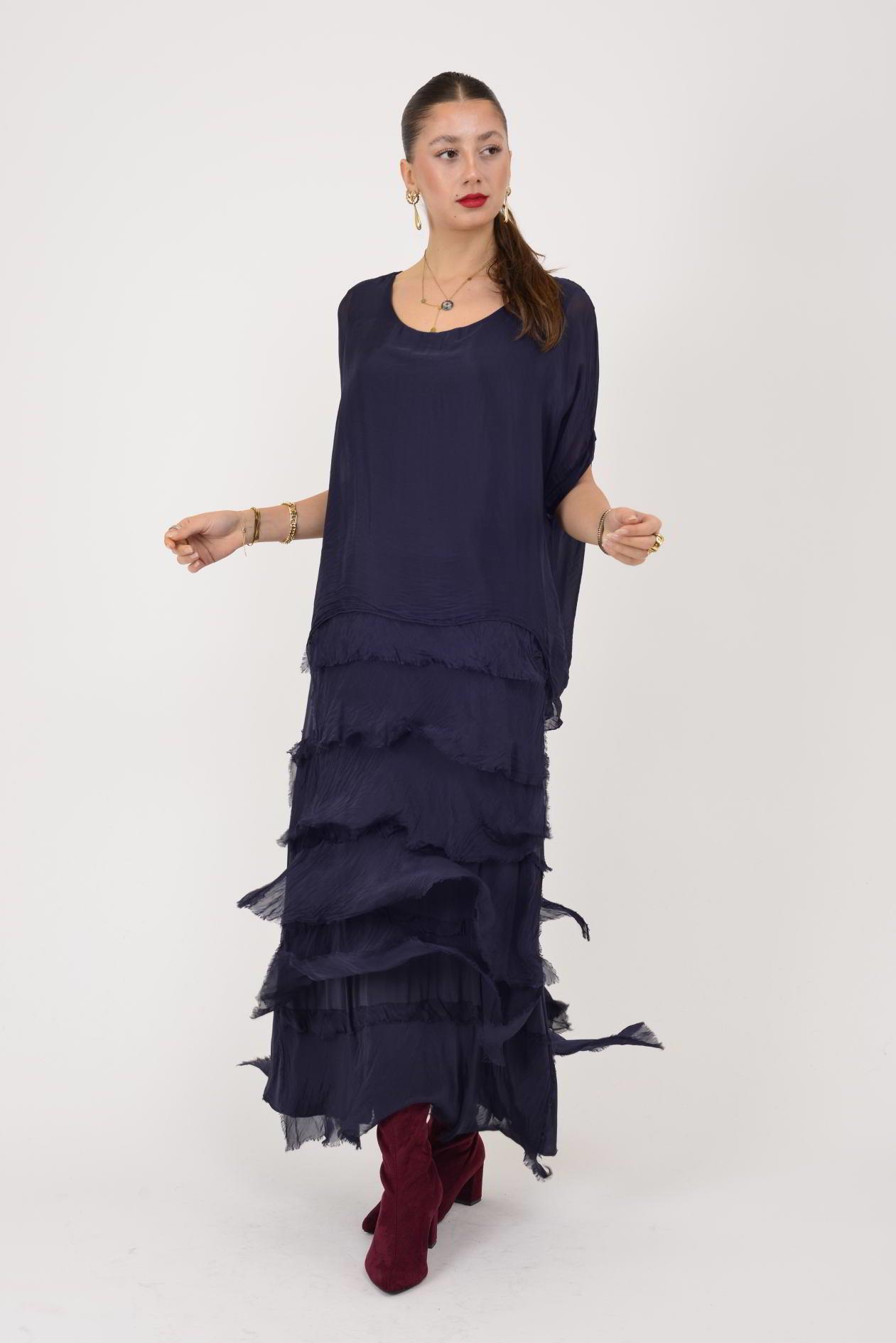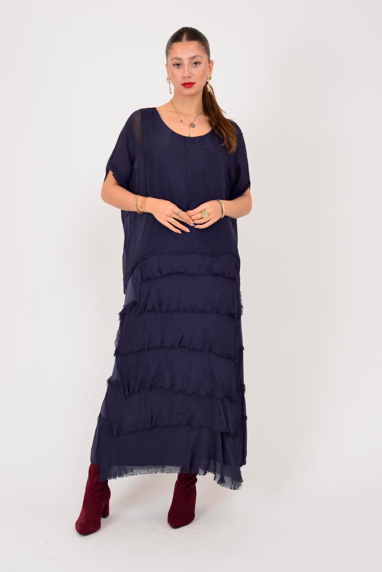 Ürün Açıklaması Kat kat detayları ve ipeksi dokusuyla öne çıkan bu elbise, zarif ve akışkan duruşuyla feminen bir stil sunar. Hafif yapısı sayesinde üzerinizde yokmuş hissi verirken, dökümlü formu vücudu sarmadan rahat ve şık bir siluet oluşturur. Hareket ettikçe canlılık kazanan kat kat tasarımı, modele gösterişli ama dengeli bir hava katar.