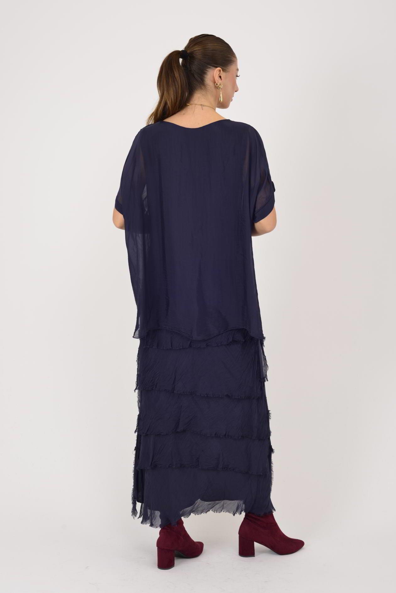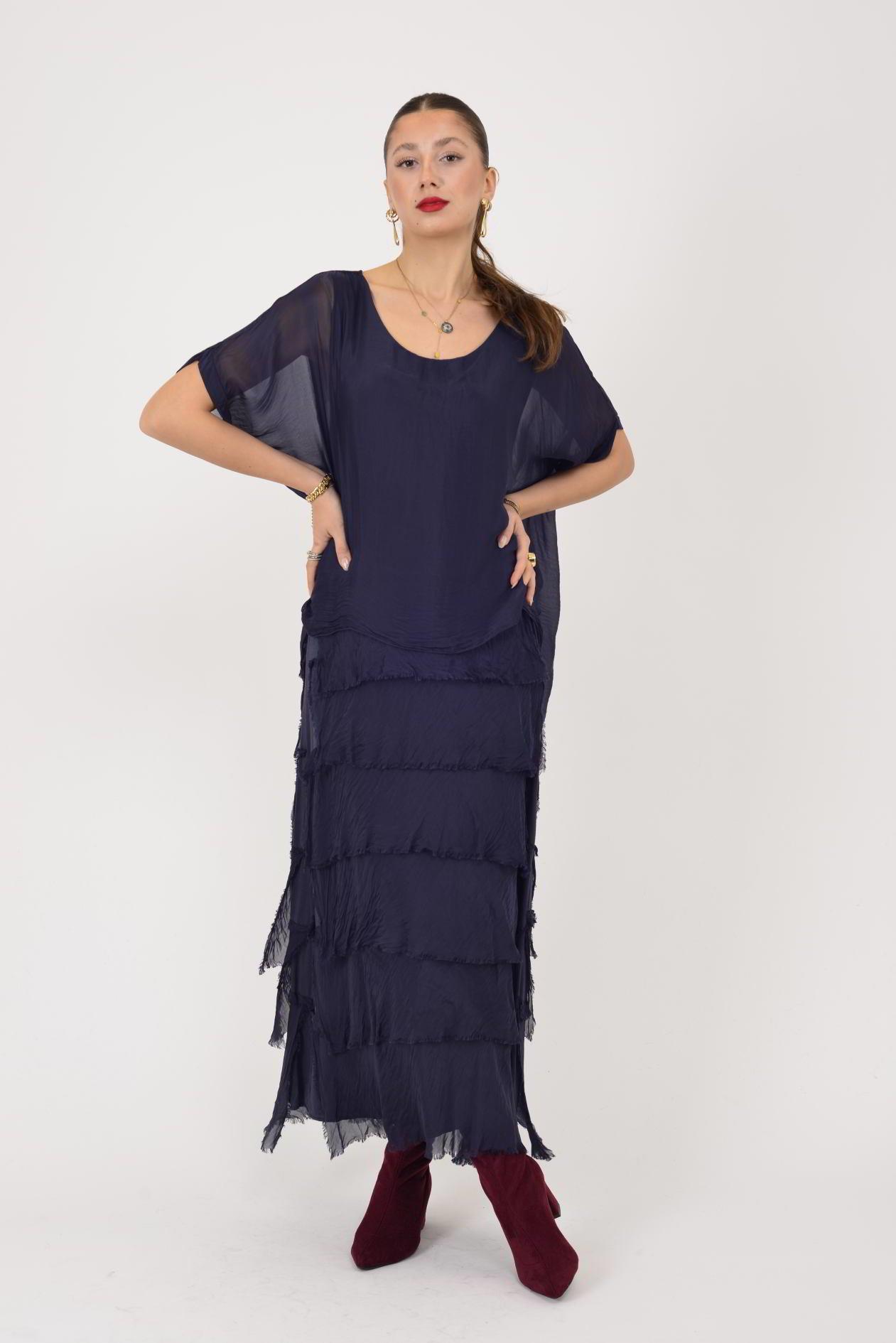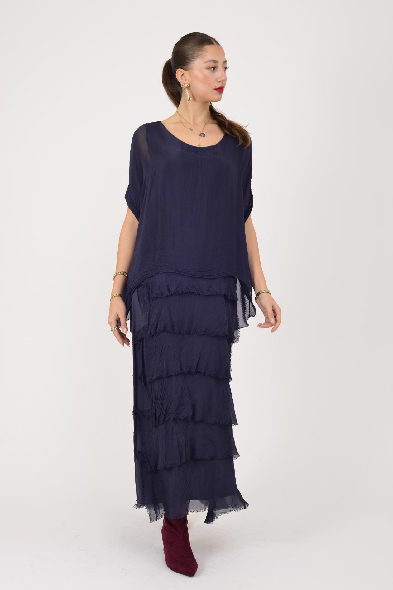 Ürün Açıklaması Kat kat detayları ve ipeksi dokusuyla öne çıkan bu elbise, zarif ve akışkan duruşuyla feminen bir stil sunar. Hafif yapısı sayesinde üzerinizde yokmuş hissi verirken, dökümlü formu vücudu sarmadan rahat ve şık bir siluet oluşturur. Hareket ettikçe canlılık kazanan kat kat tasarımı, modele gösterişli ama dengeli bir hava katar.
