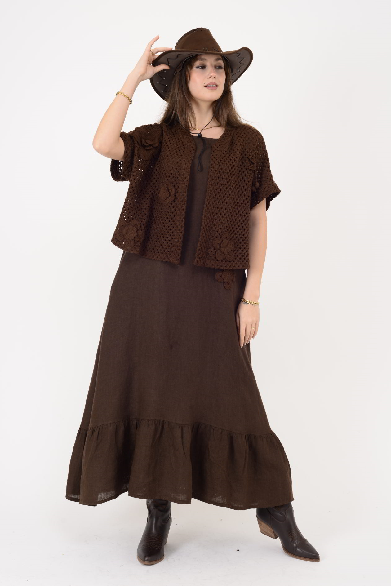 25585 APLİKE ÇİÇEK DETAYLI AJURLU BOLEROLU 2'Lİ KETEN TAKIM ELBİSE (26Y.T.TKM.00013-005)