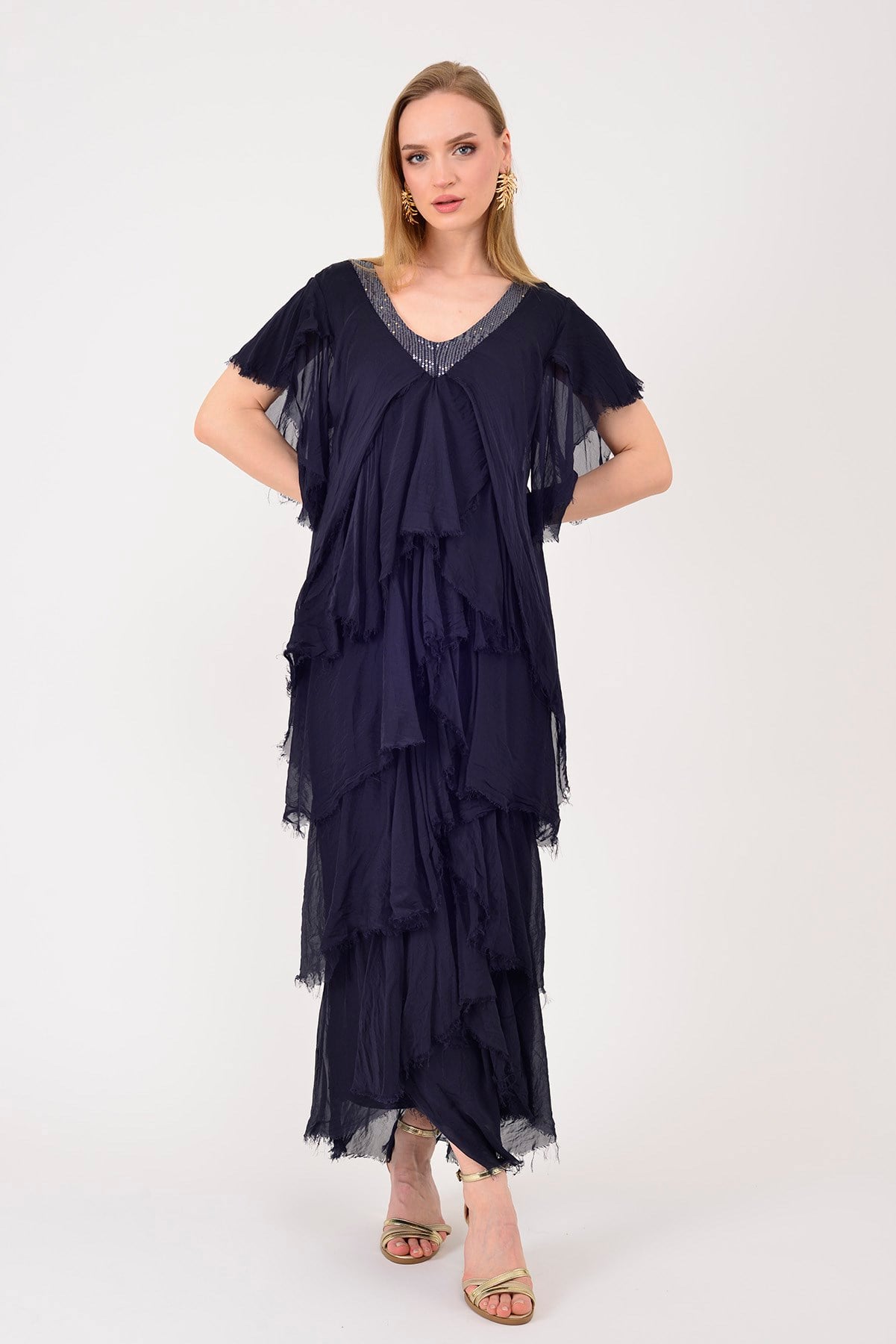 65714 PAYET DETAYLI V YAKA KAT KAT İPEK ELBİSE (25Y.T.ELB.00333-004)