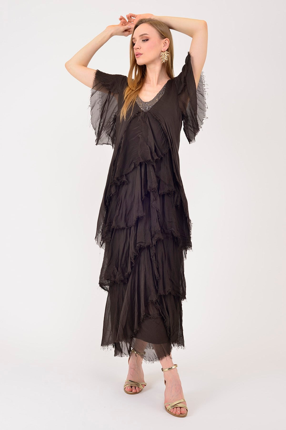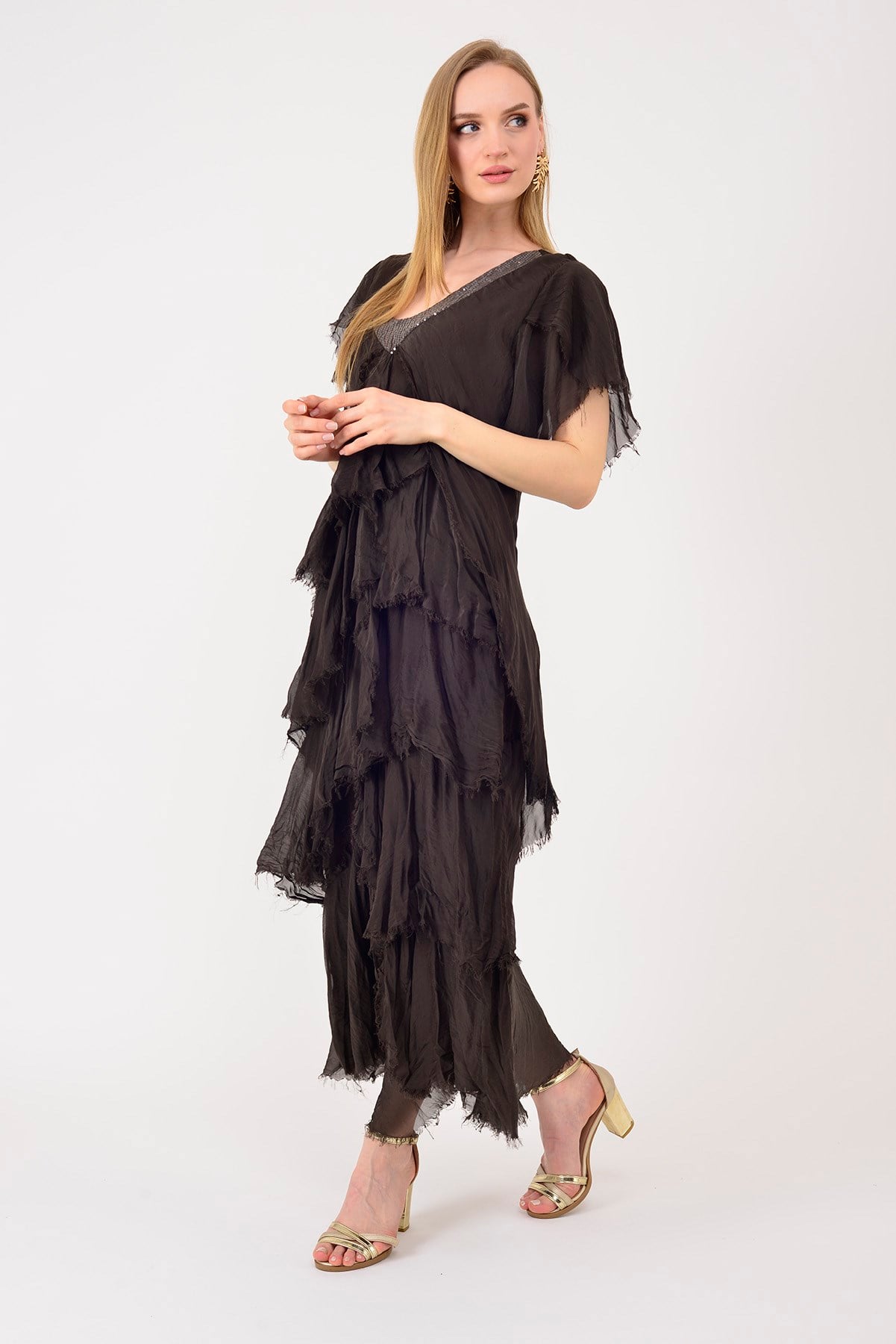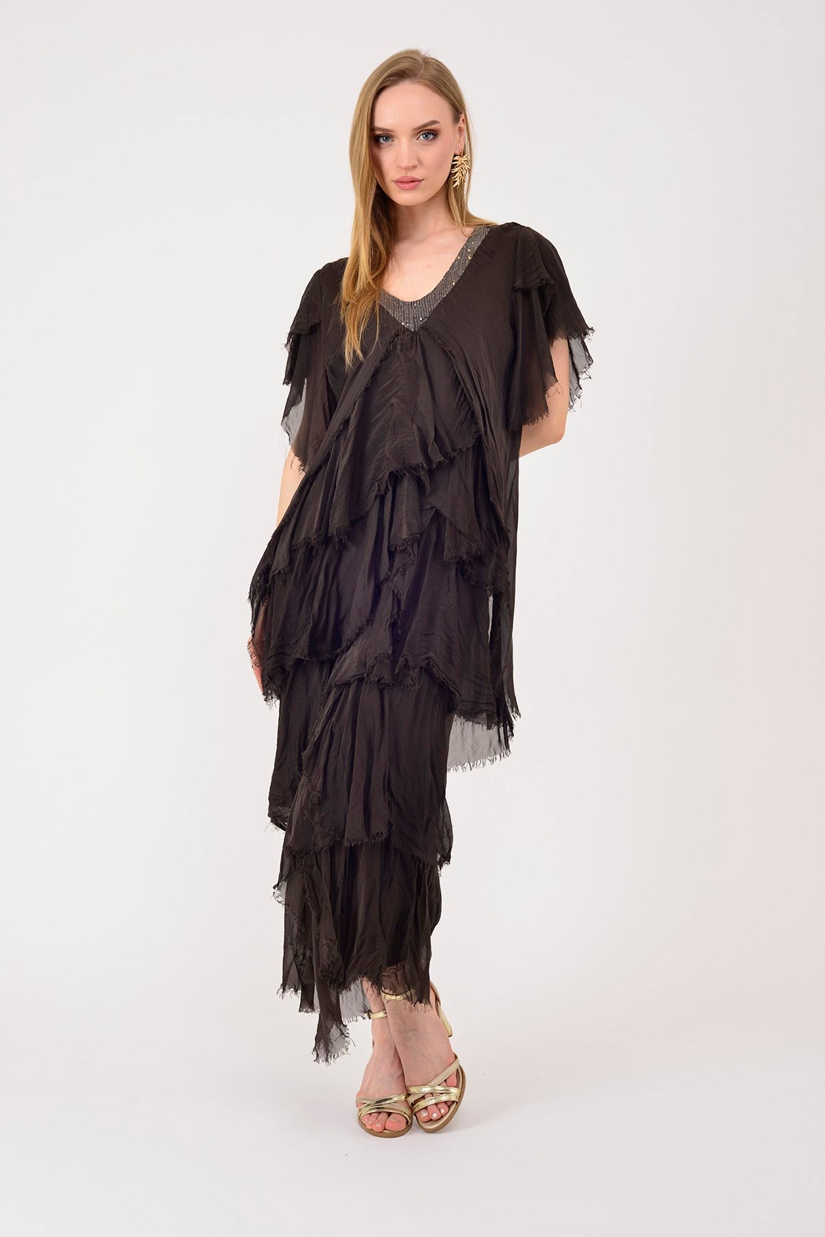 65714 PAYET DETAYLI V YAKA KAT KAT İPEK ELBİSE (25Y.T.ELB.00333-005)