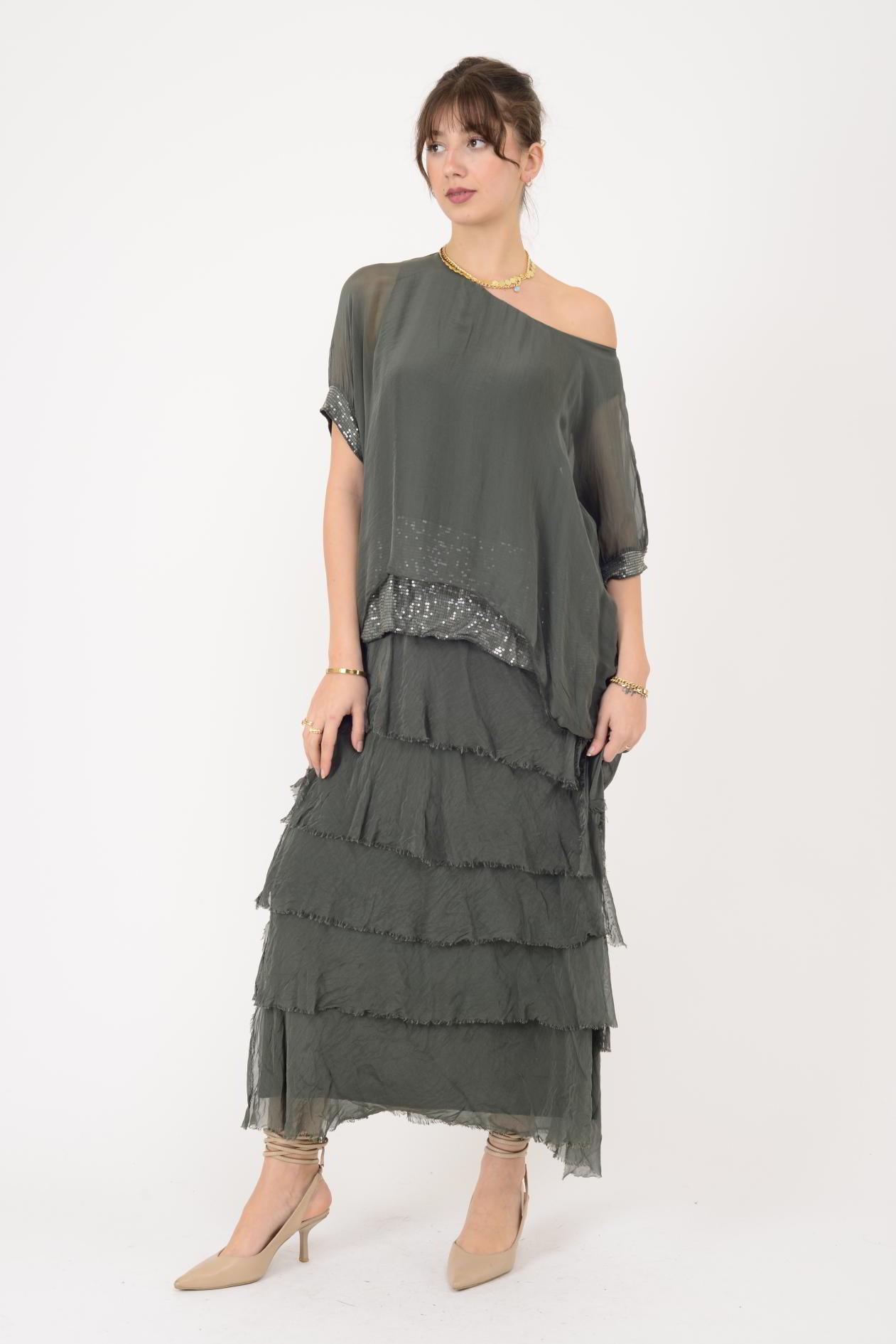 7266 YARASA KOL PAYET DETAYLI KAT KAT İPEK ELBİSE (25Y.T.ELB.00283-020)