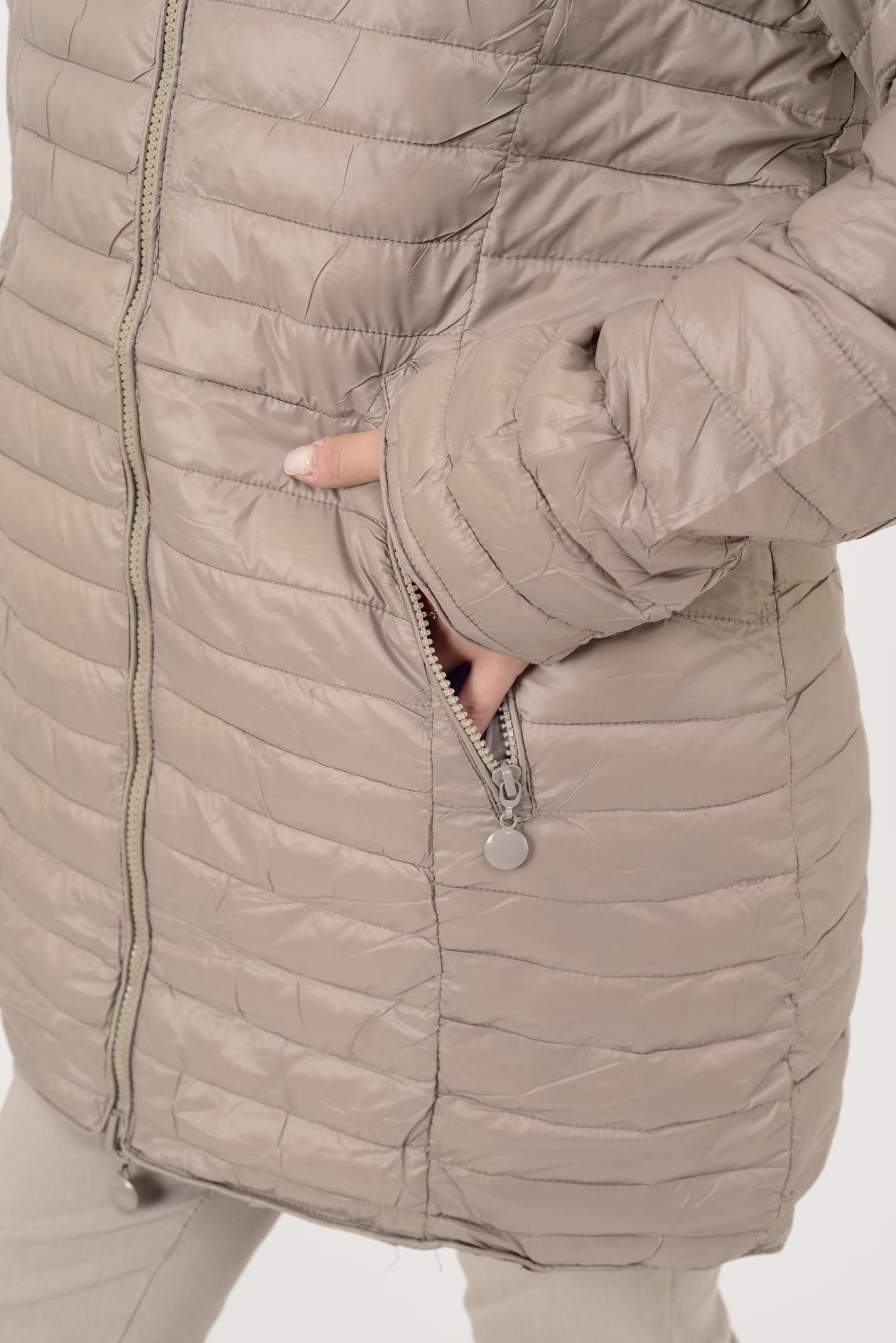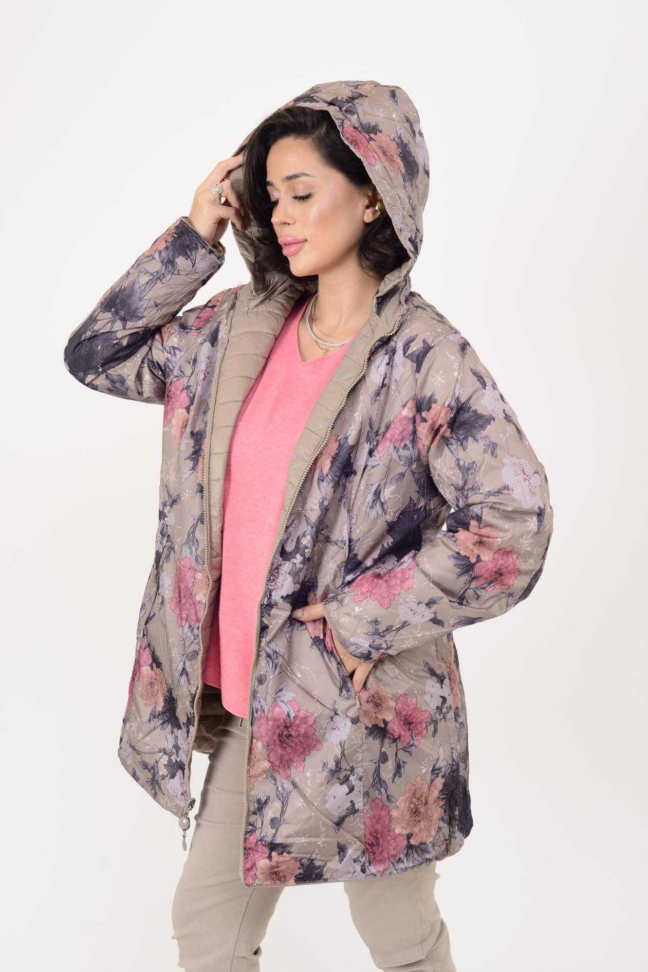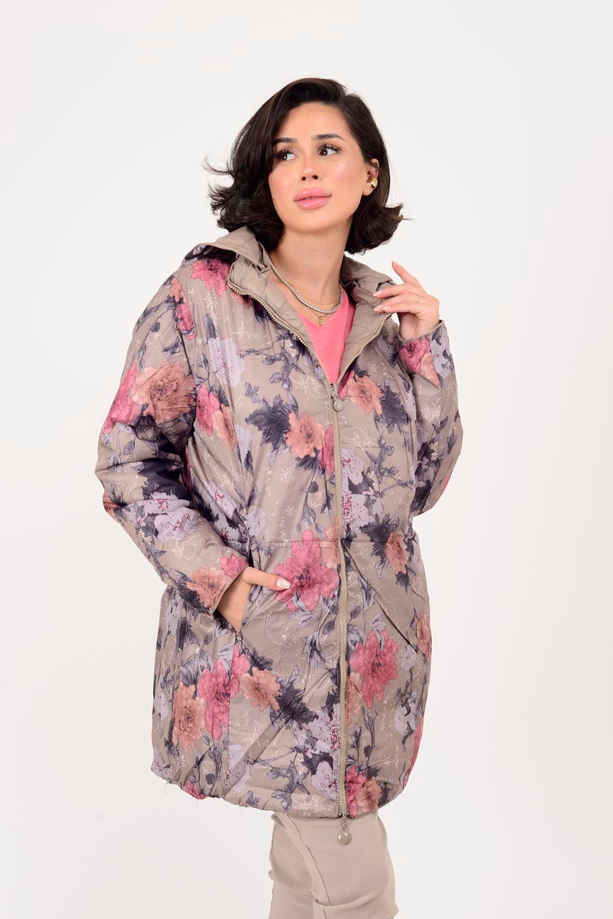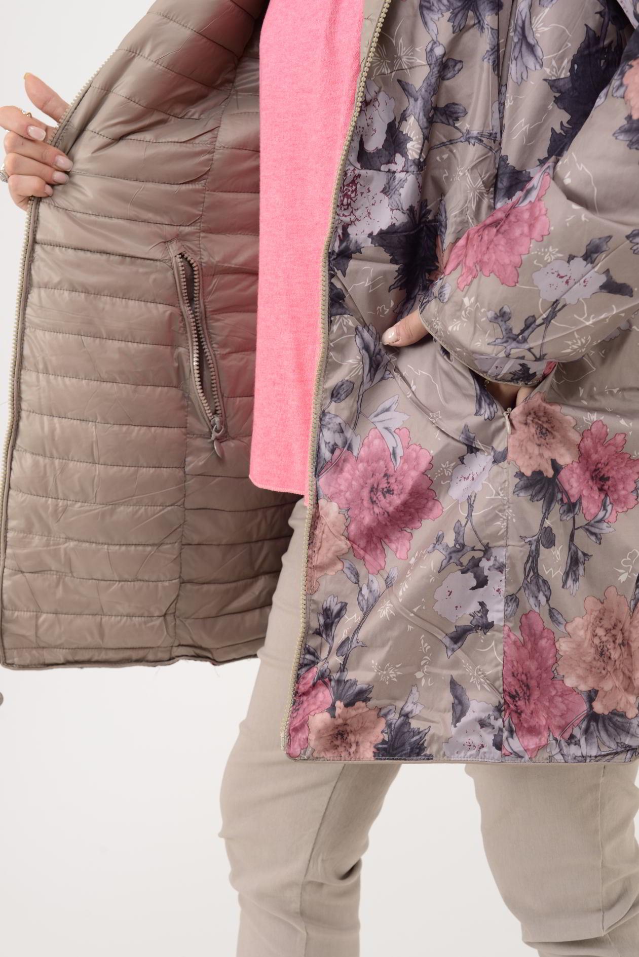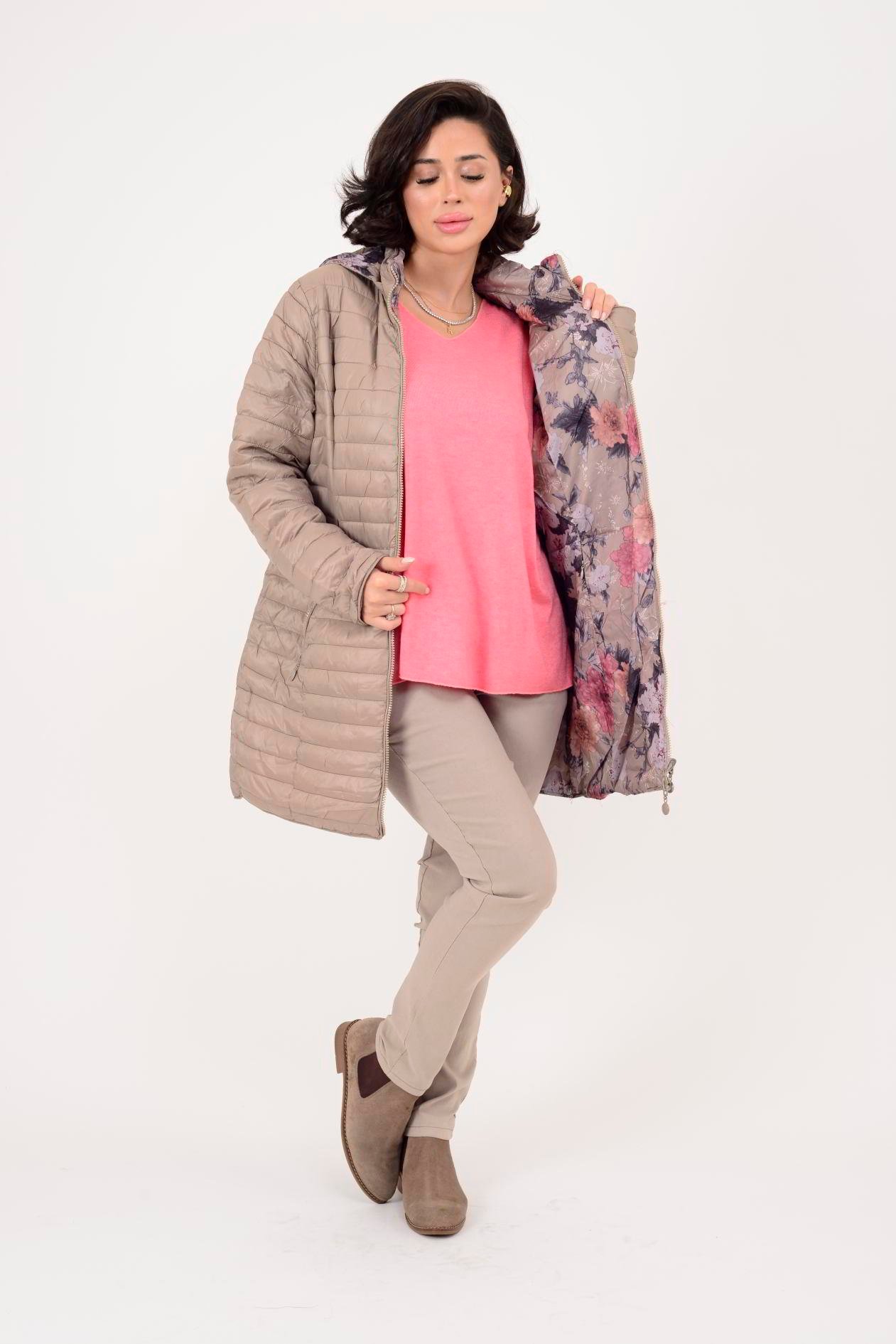 Her iki yüzü de kullanılabilir; çift taraflı tasarımı farklı kombinlerle uyum sağlar. Bir yüzü zarif çiçek desenli astar, diğer yüzü ise şişme mont formundadır. Geniş kalıptır.