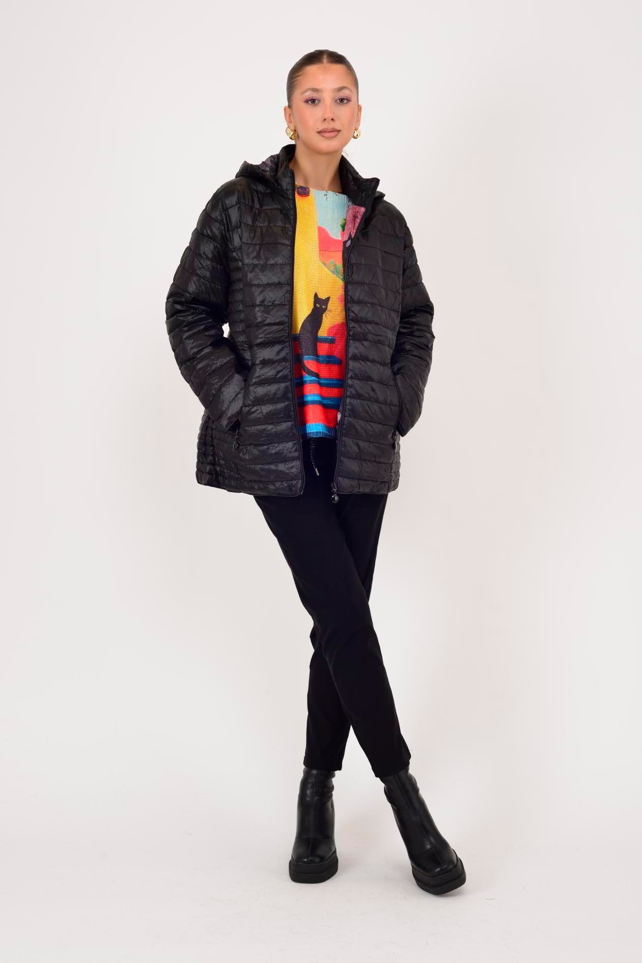 Çiçek desenli iç astarıyla dikkat çeken bu kapitone mont; hafif yapısı ve sıcak tutan dolgusu ile günlük kullanıma uygundur. Su itici özelliğe sahip kumaşı sayesinde serin havalarda ideal bir dış giyim seçeneğidir. Geniş kalıptır.