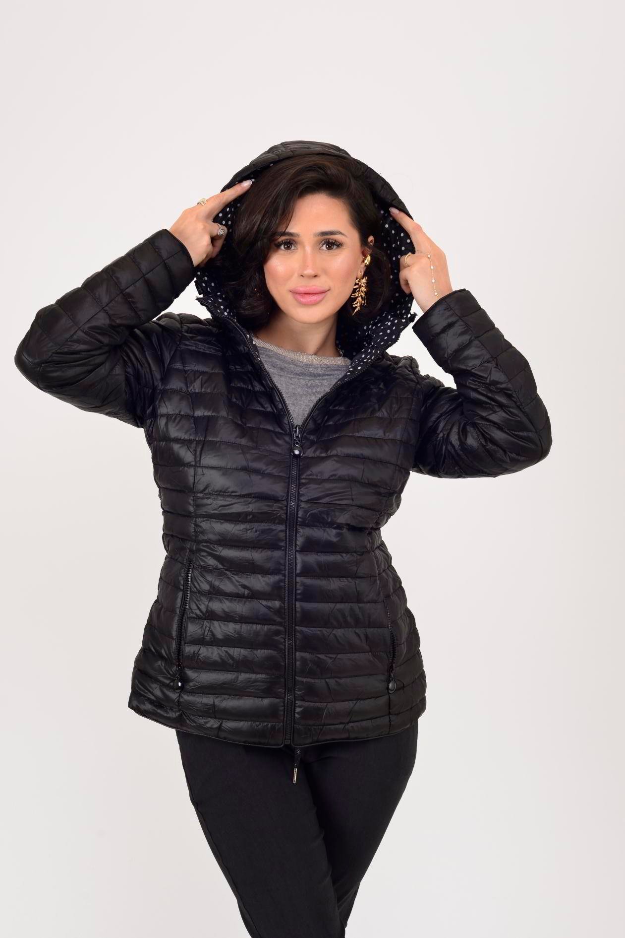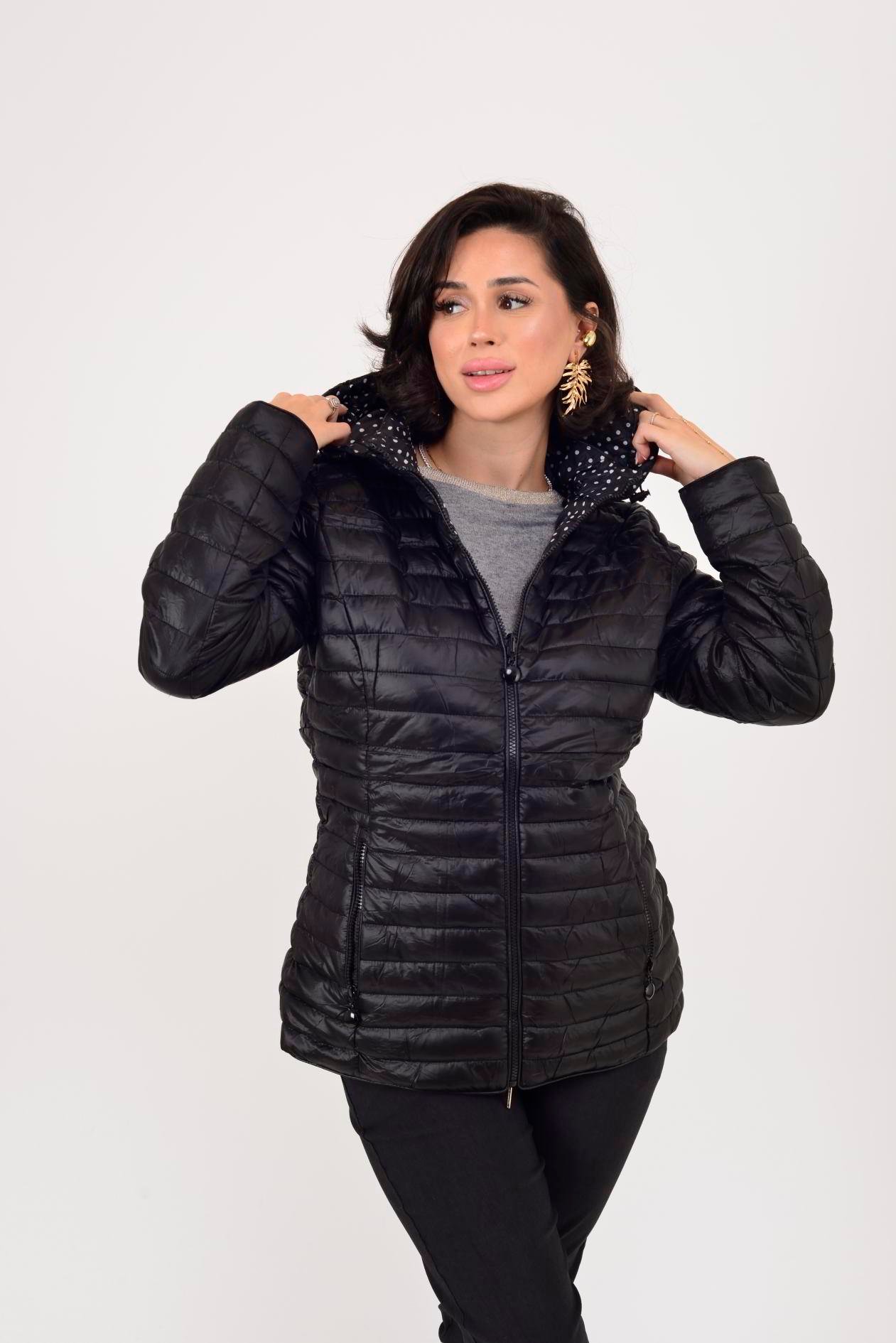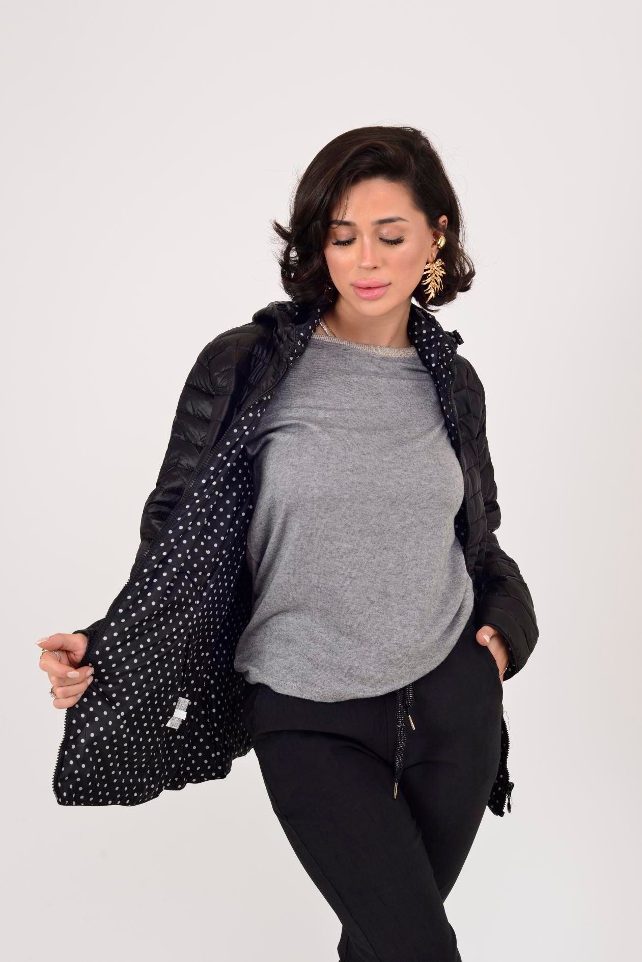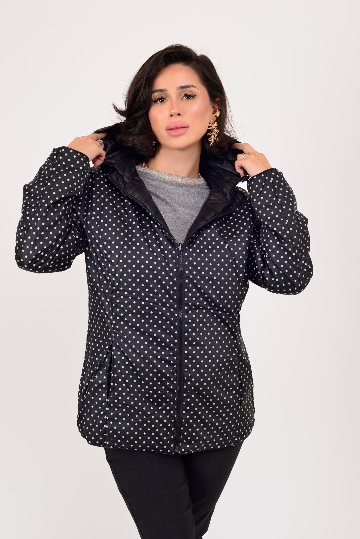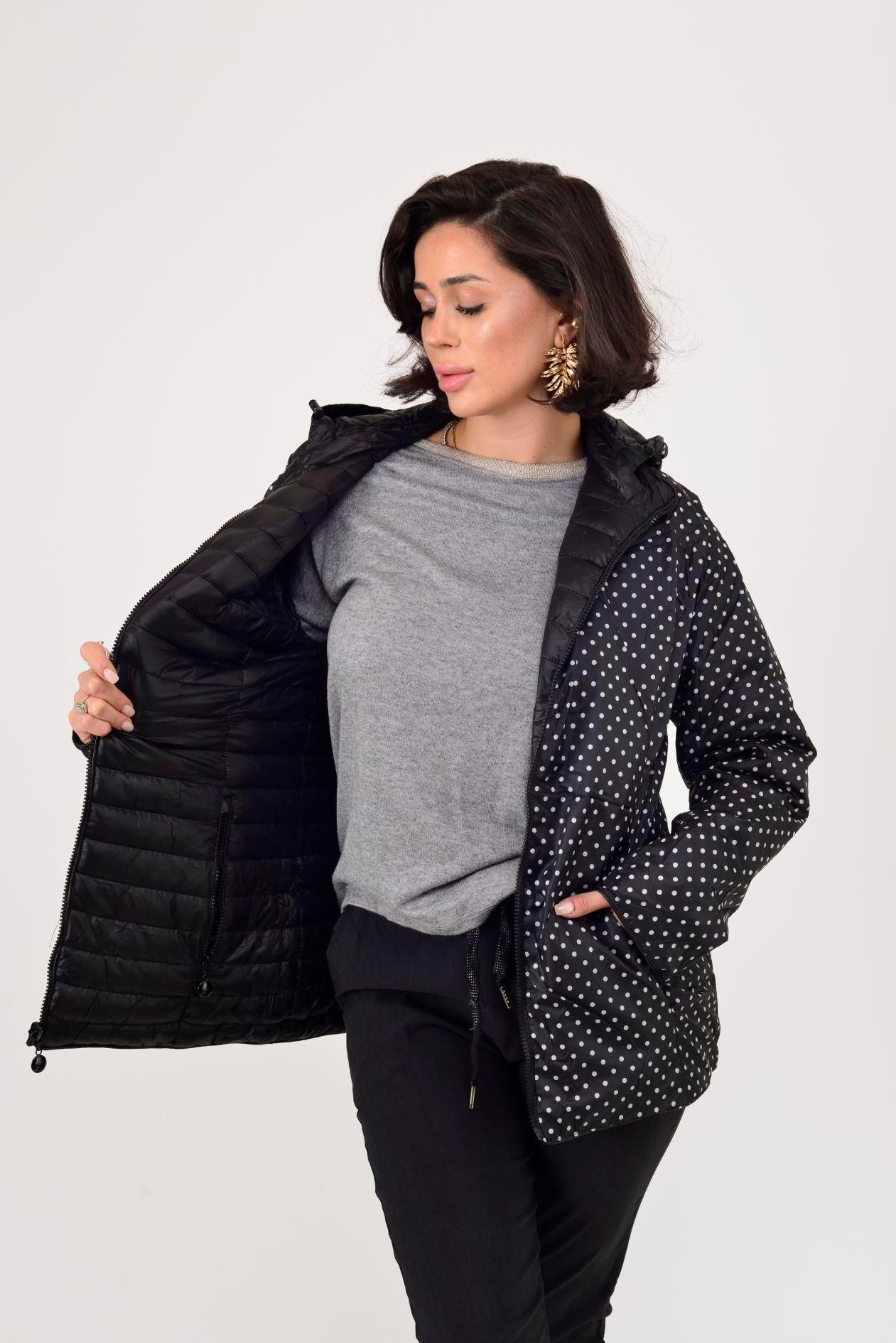 Her iki yüzü de kullanılabilir. Çift taraflı tasarımı sayesinde farklı kombinlerle uyum sağlar. Bir yüzü zarif puantiye desenli astar, diğer yüzü ise şişme mont formundadır. Geniş kalıptır.