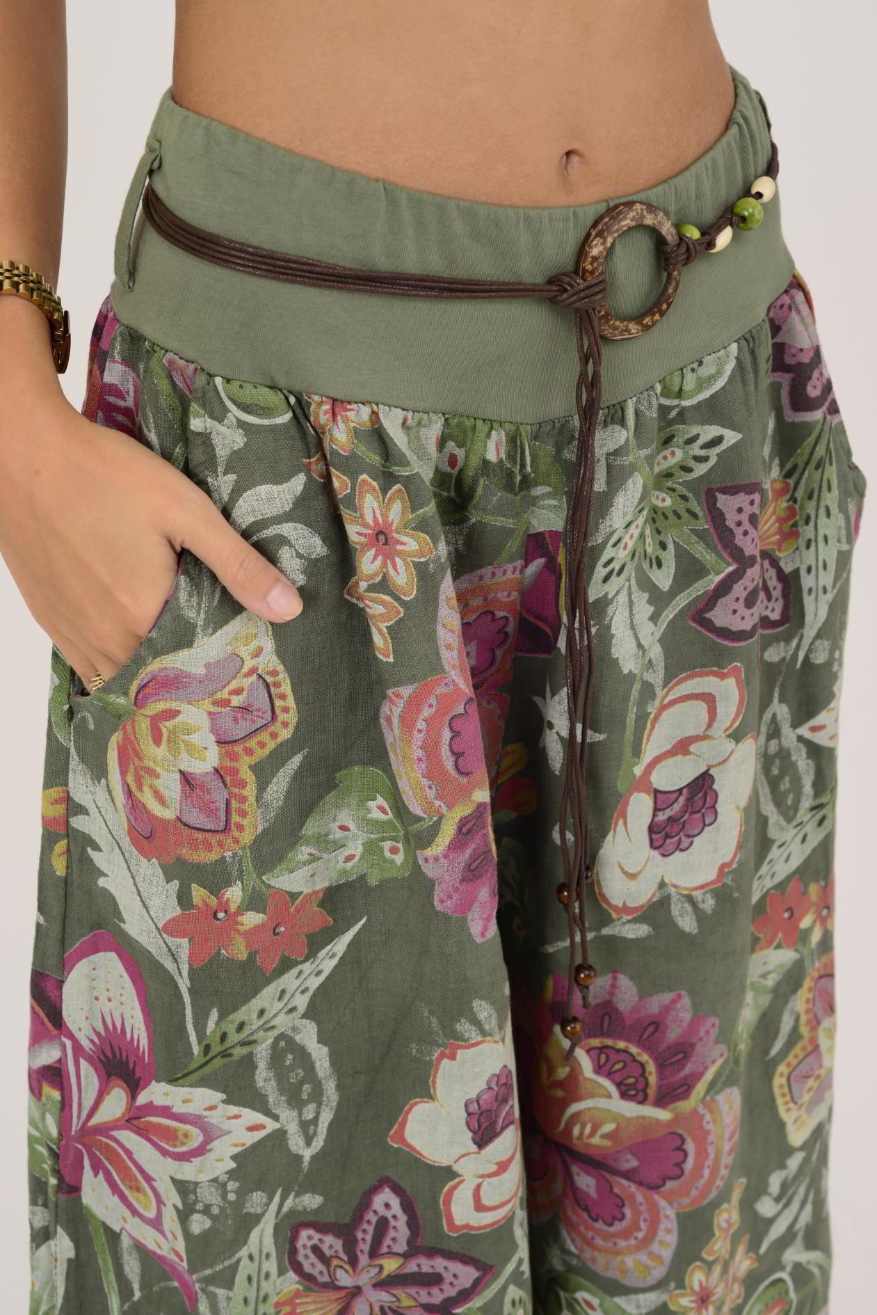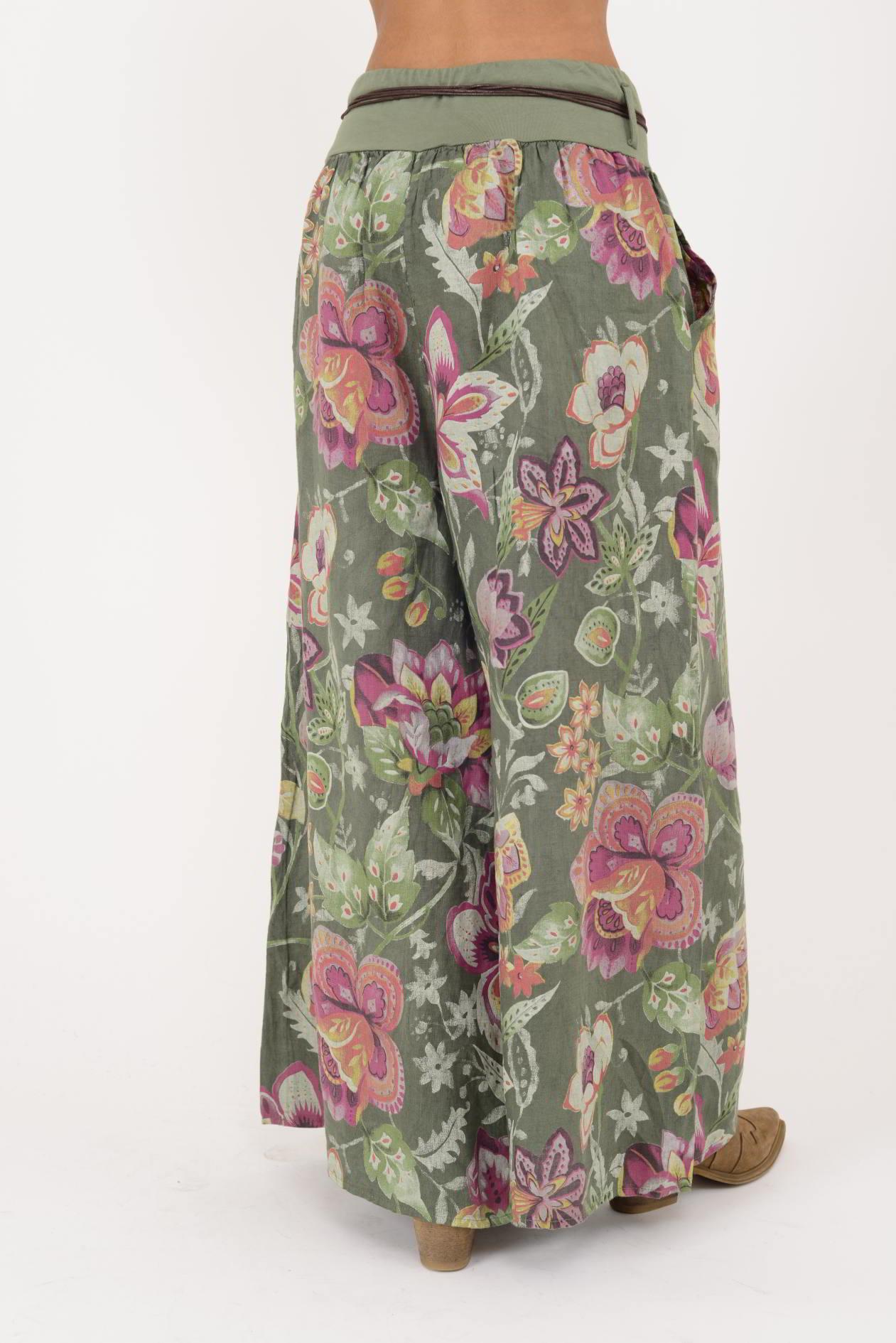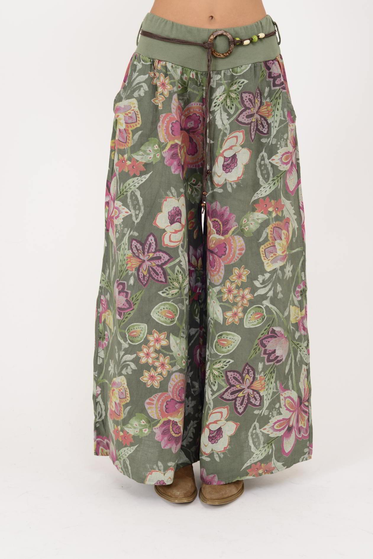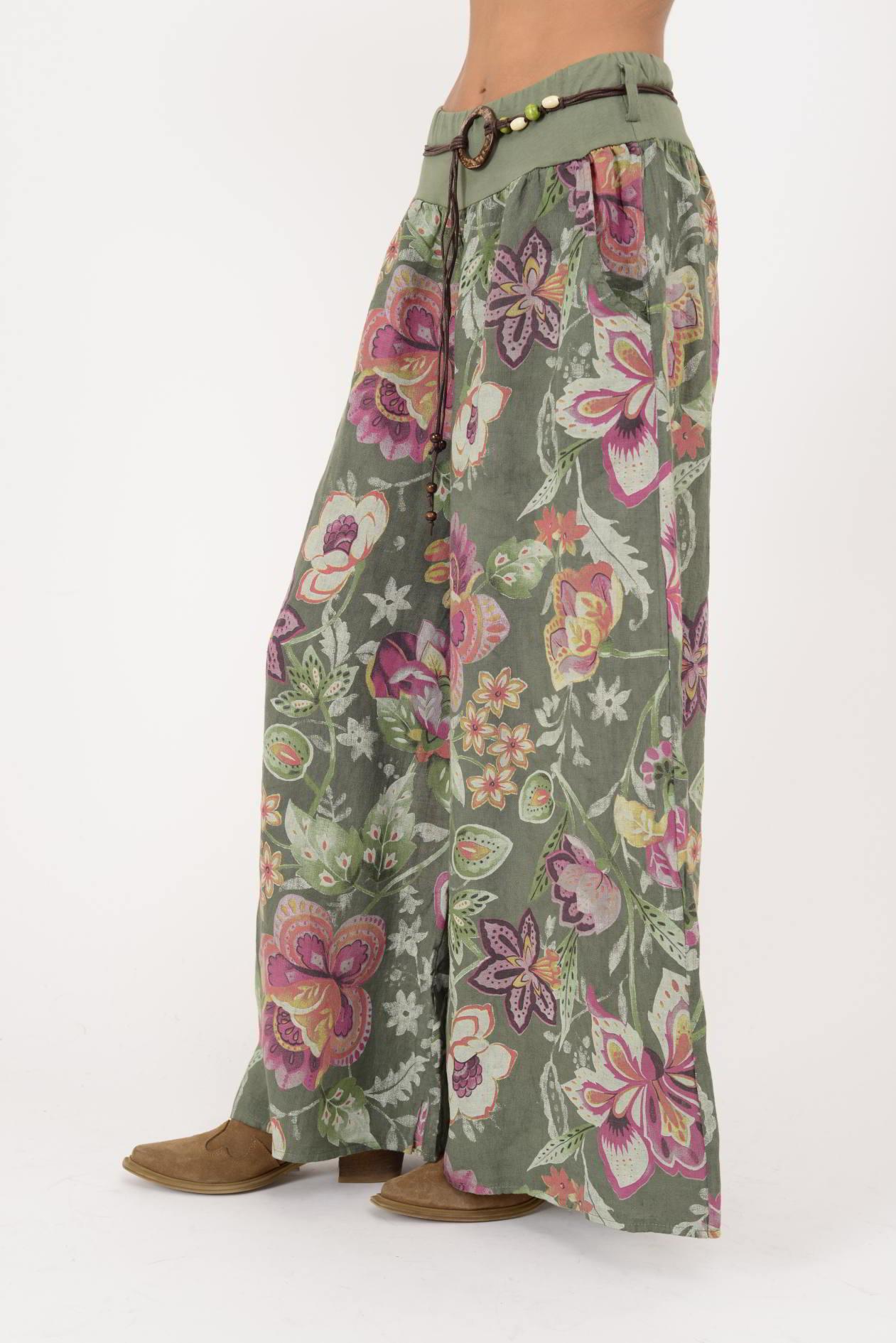 9530 FLORAL DESEN GENİŞ PAÇA KEMERLİ KETEN PANTOLON (25Y.T.PNT.00167-020)