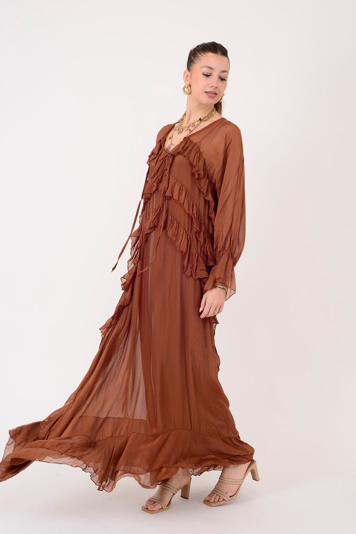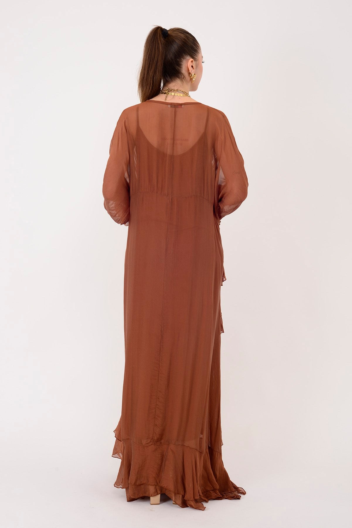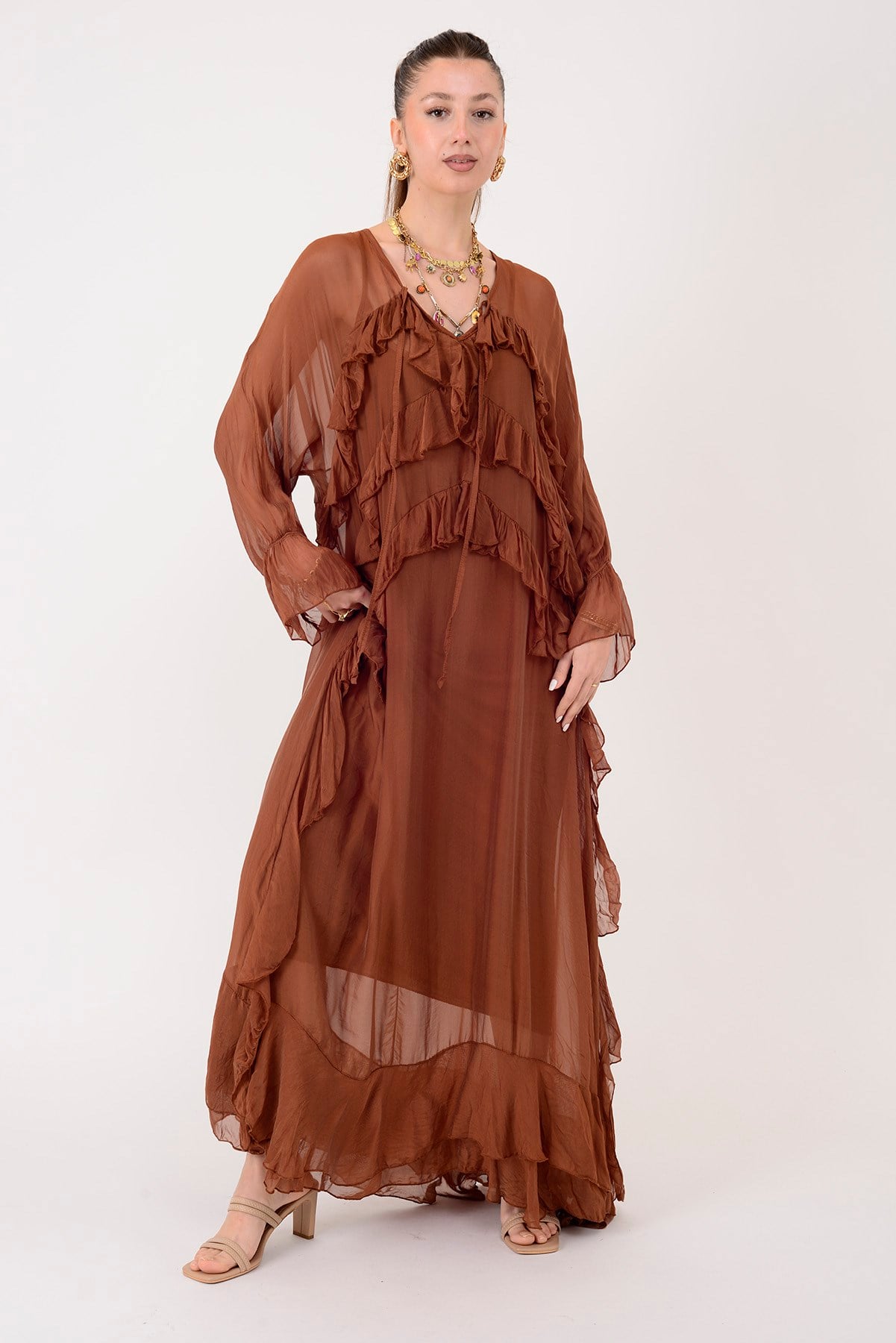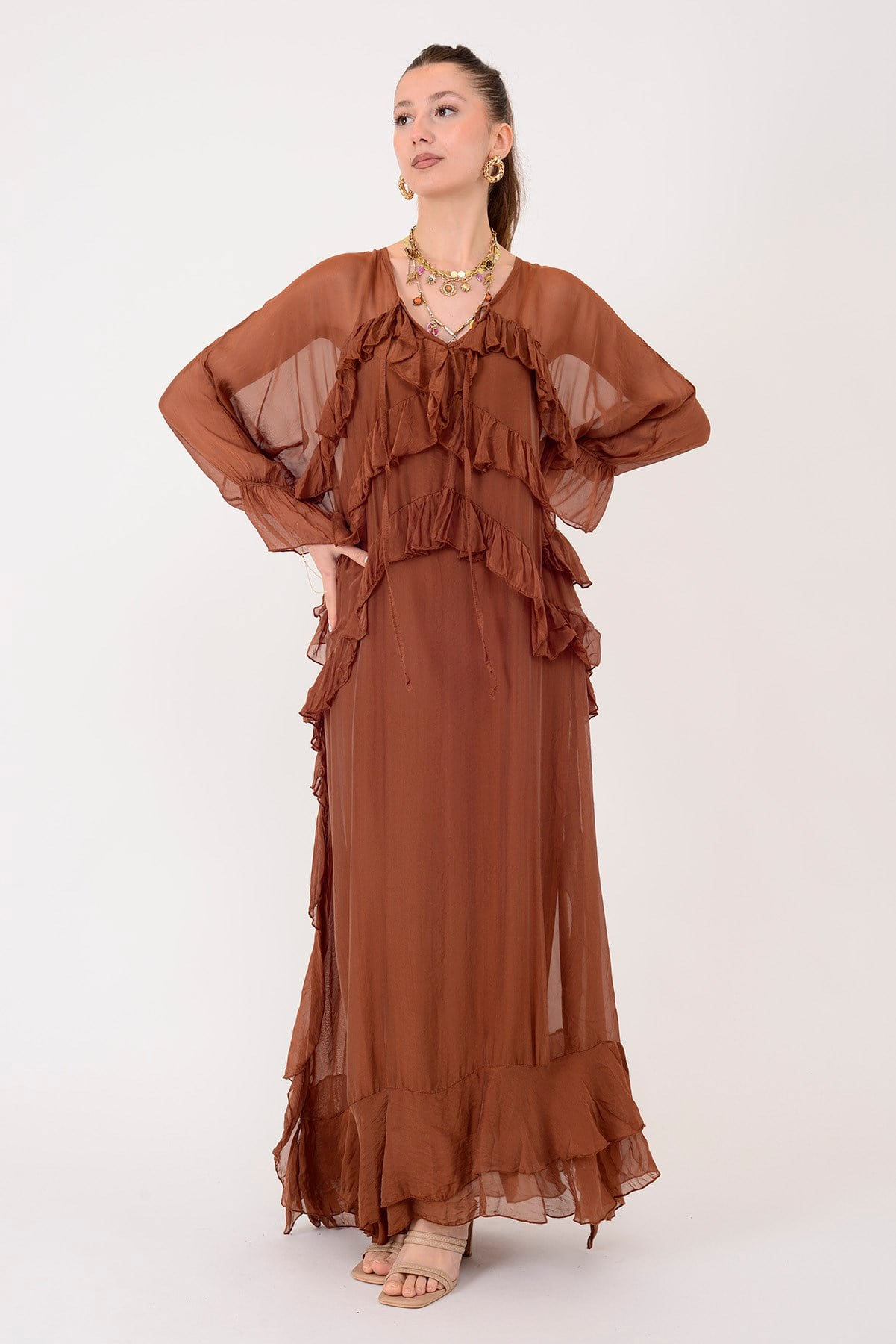 7522 DUBLIN FARBALALI ASTARLI UZUN İPEK ELBİSE (26Y.T.ELB.00022-005)