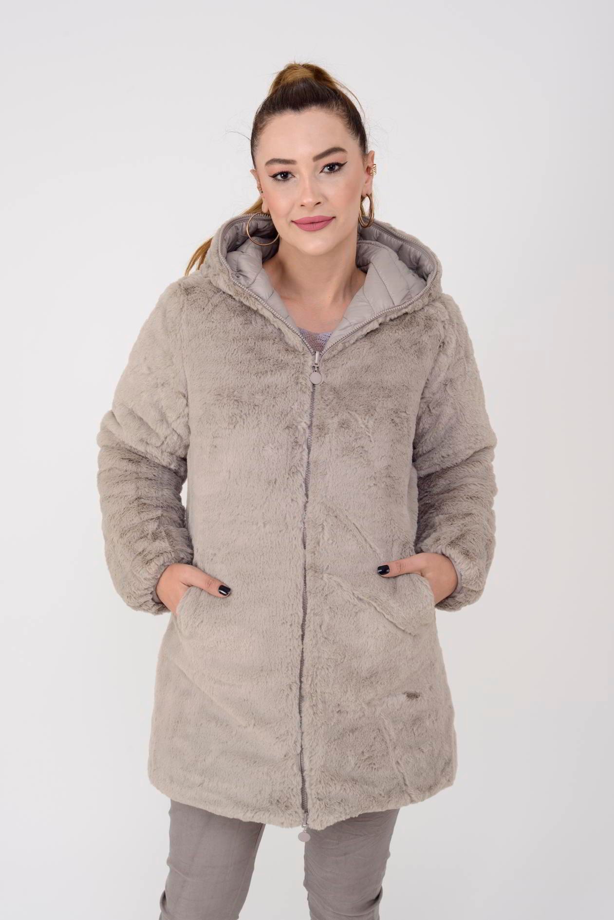 Geniş kalıptır. Kürk detaylı yüzeyi yumuşak peluş dokudadır; diğer yüzeyi ise şişme mont formundadır.