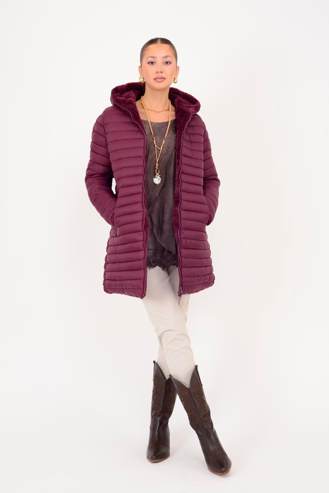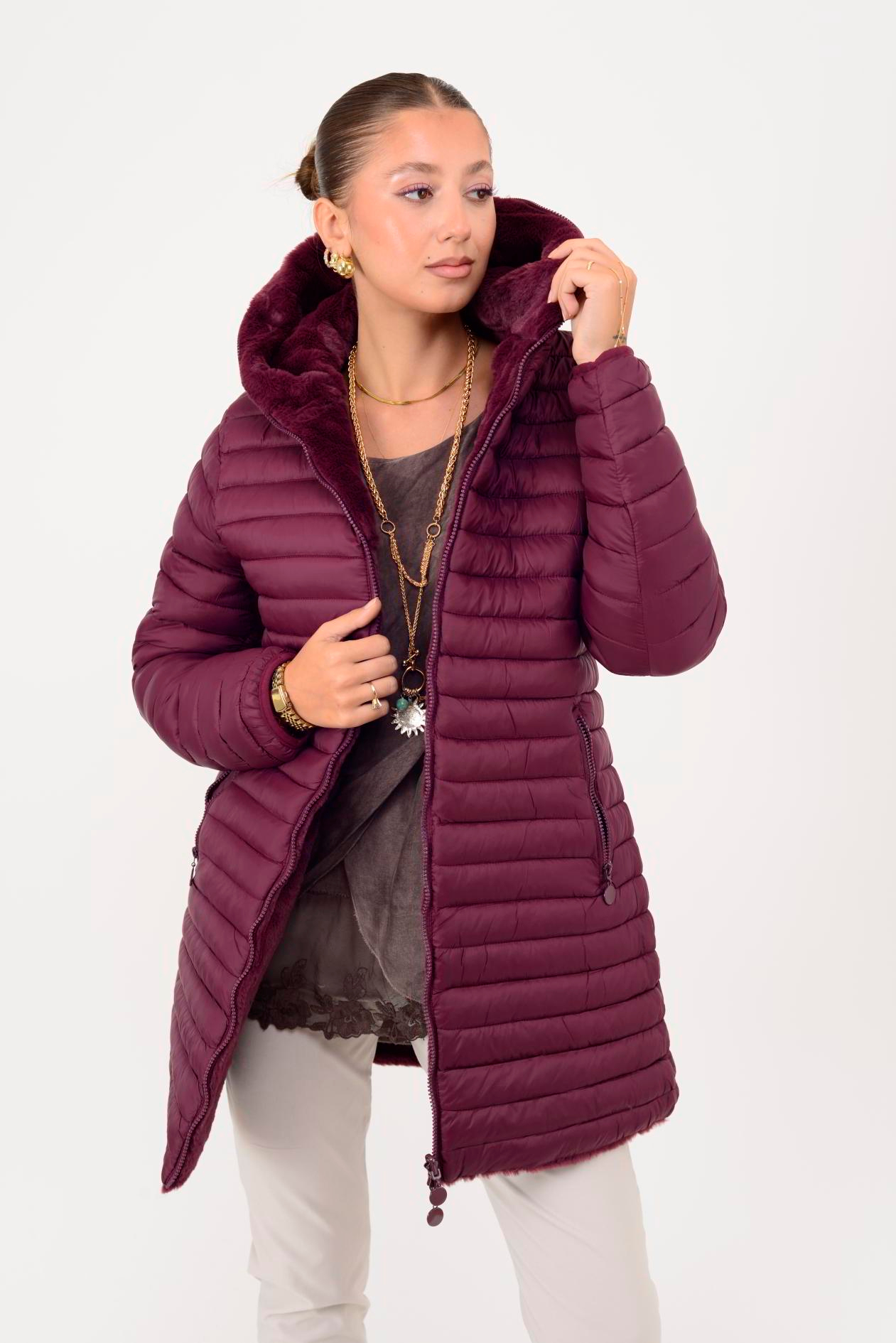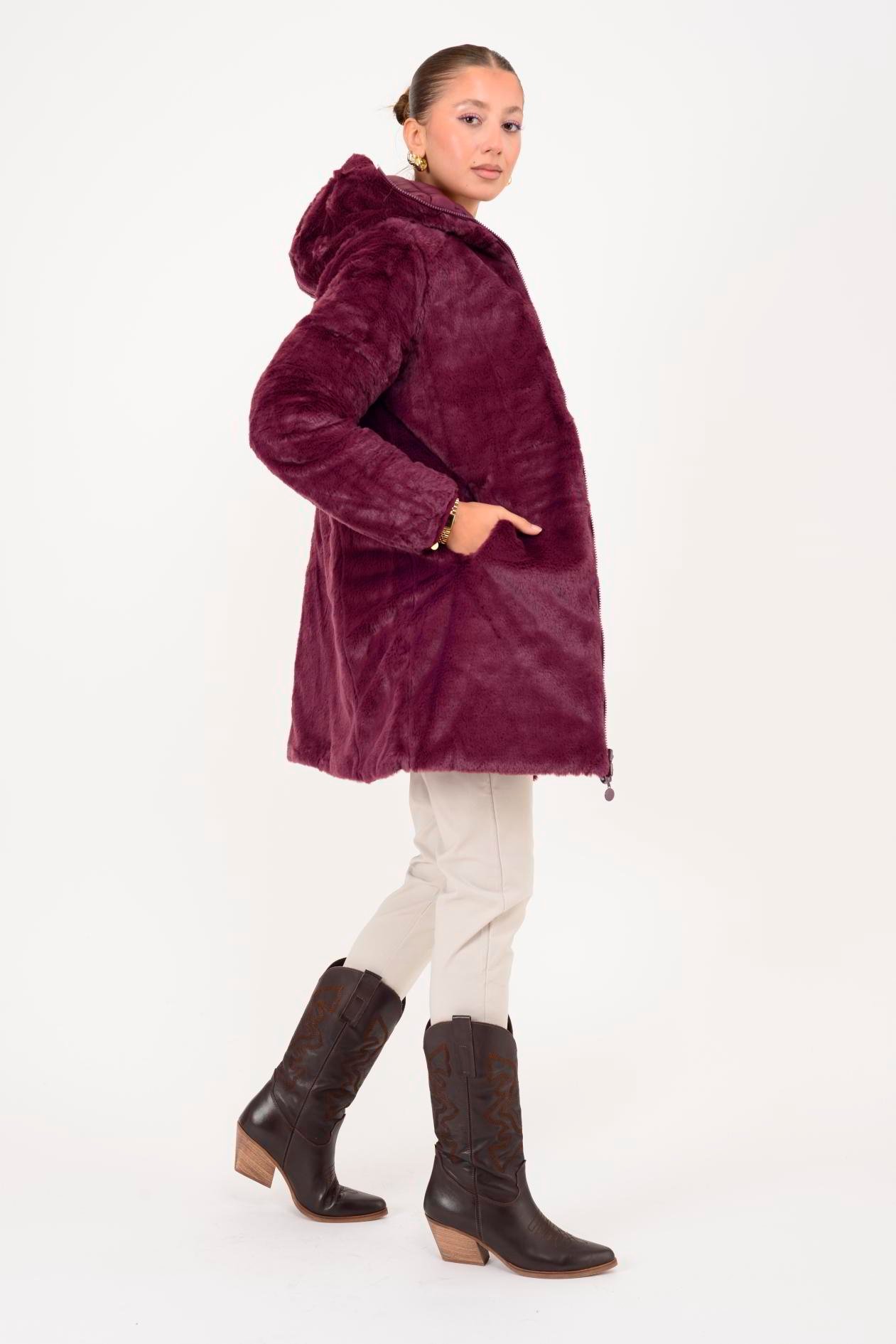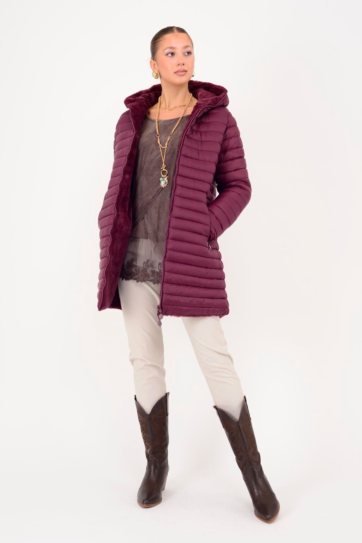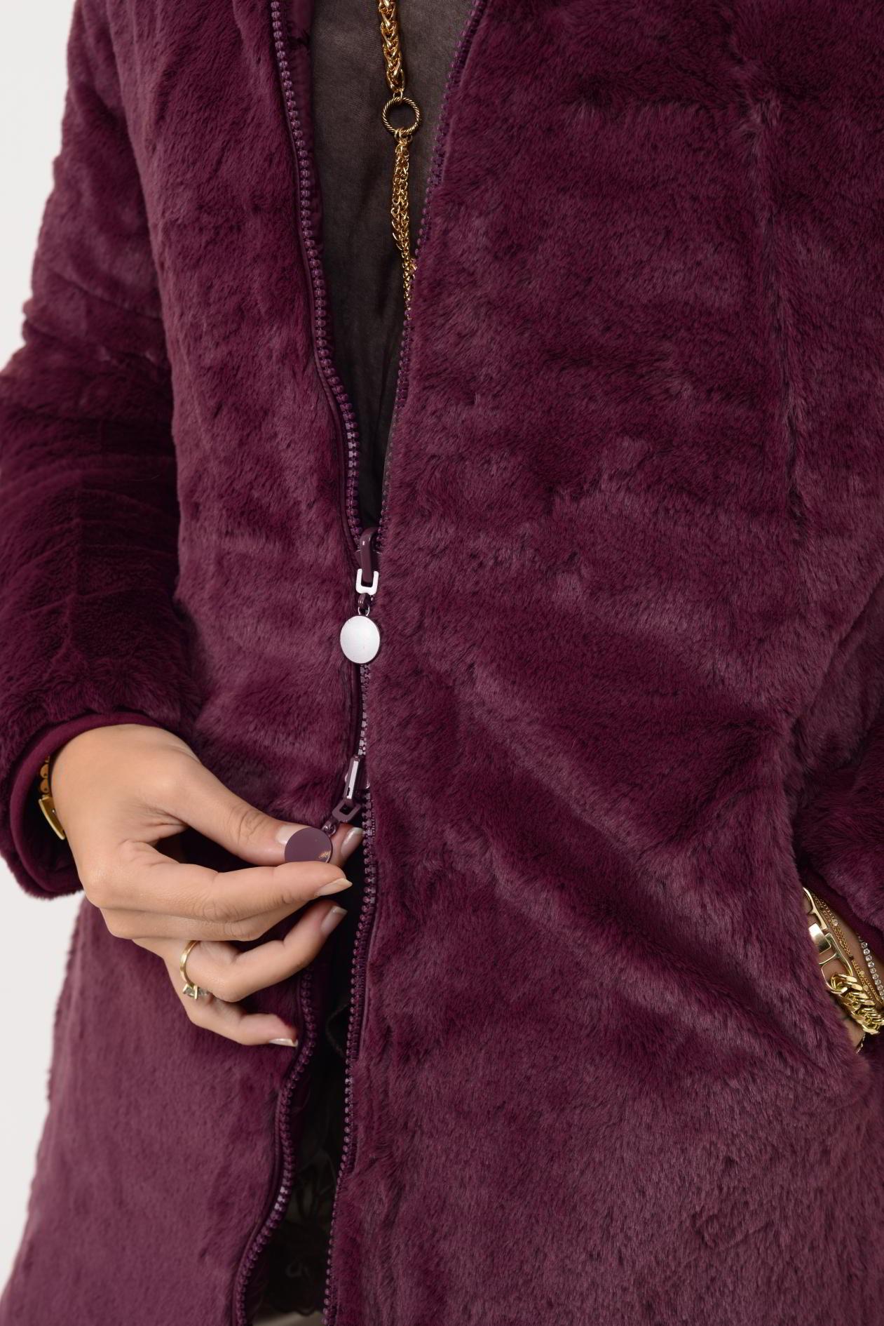 Her iki yüzü de kullanılabilir. Çift taraflı tasarımı sayesinde farklı kombinlerle uyum sağlar. Geniş kalıptır. Kürk detaylı yüzeyi yumuşak peluş dokudadır; diğer yüzeyi ise şişme mont formundadır.