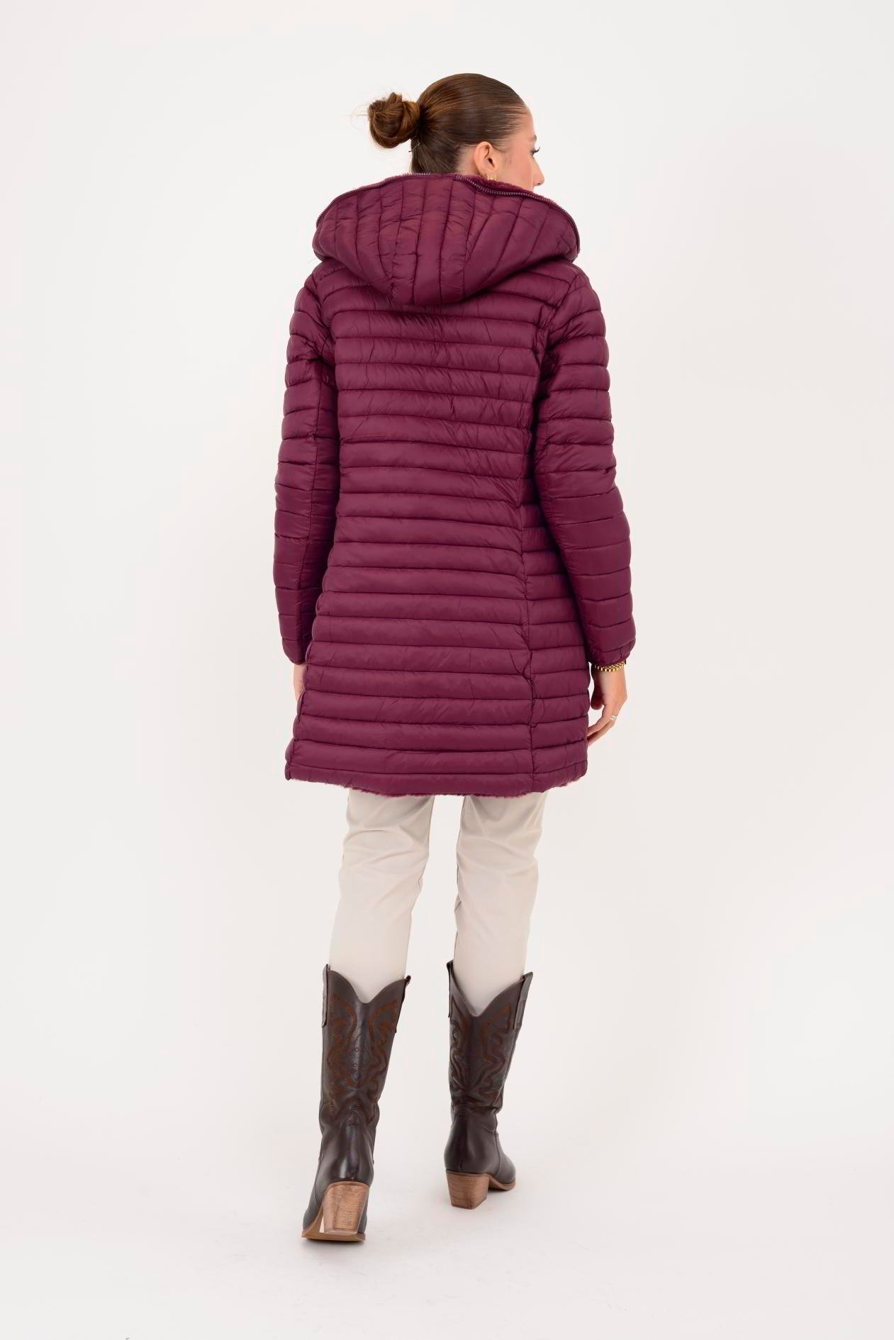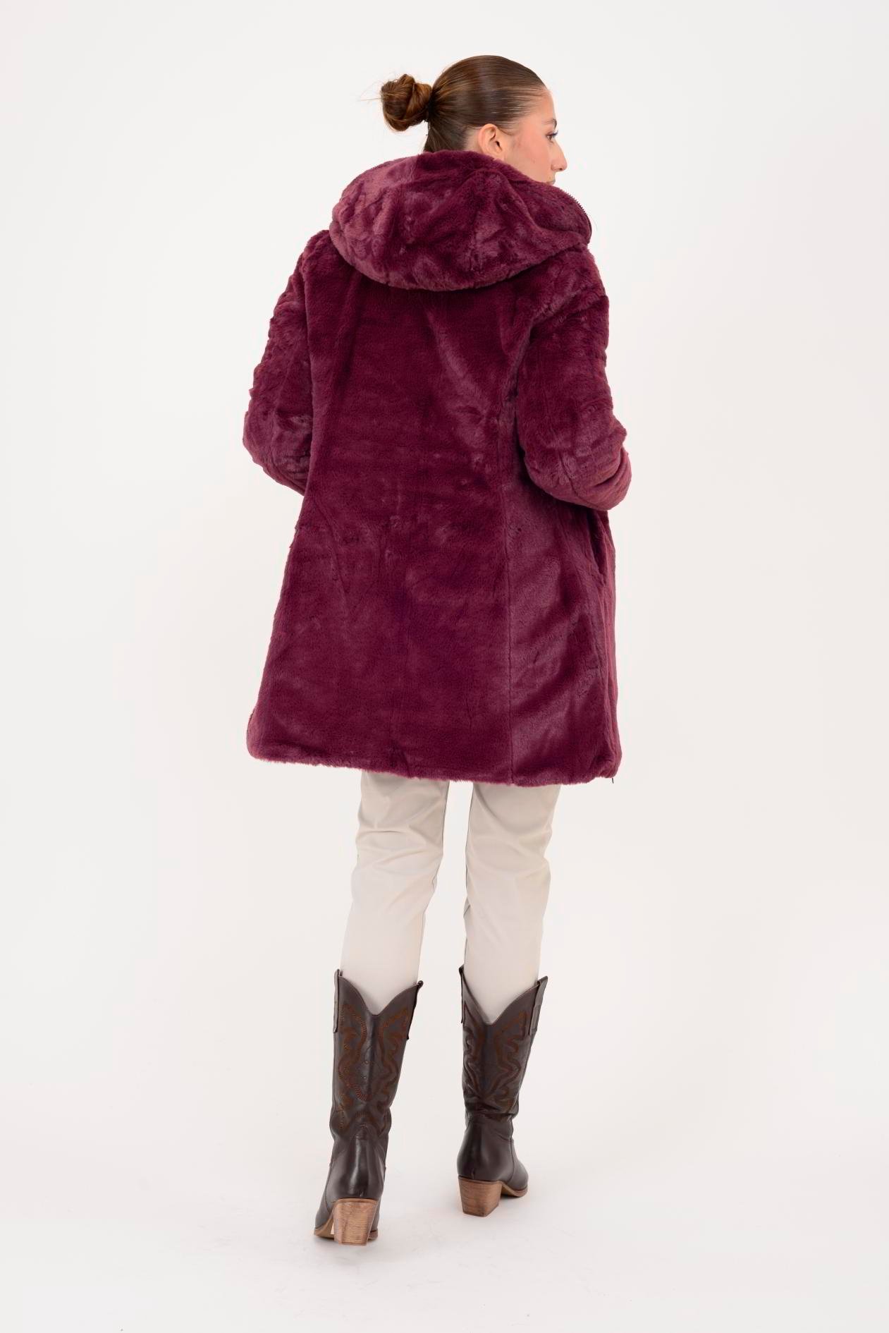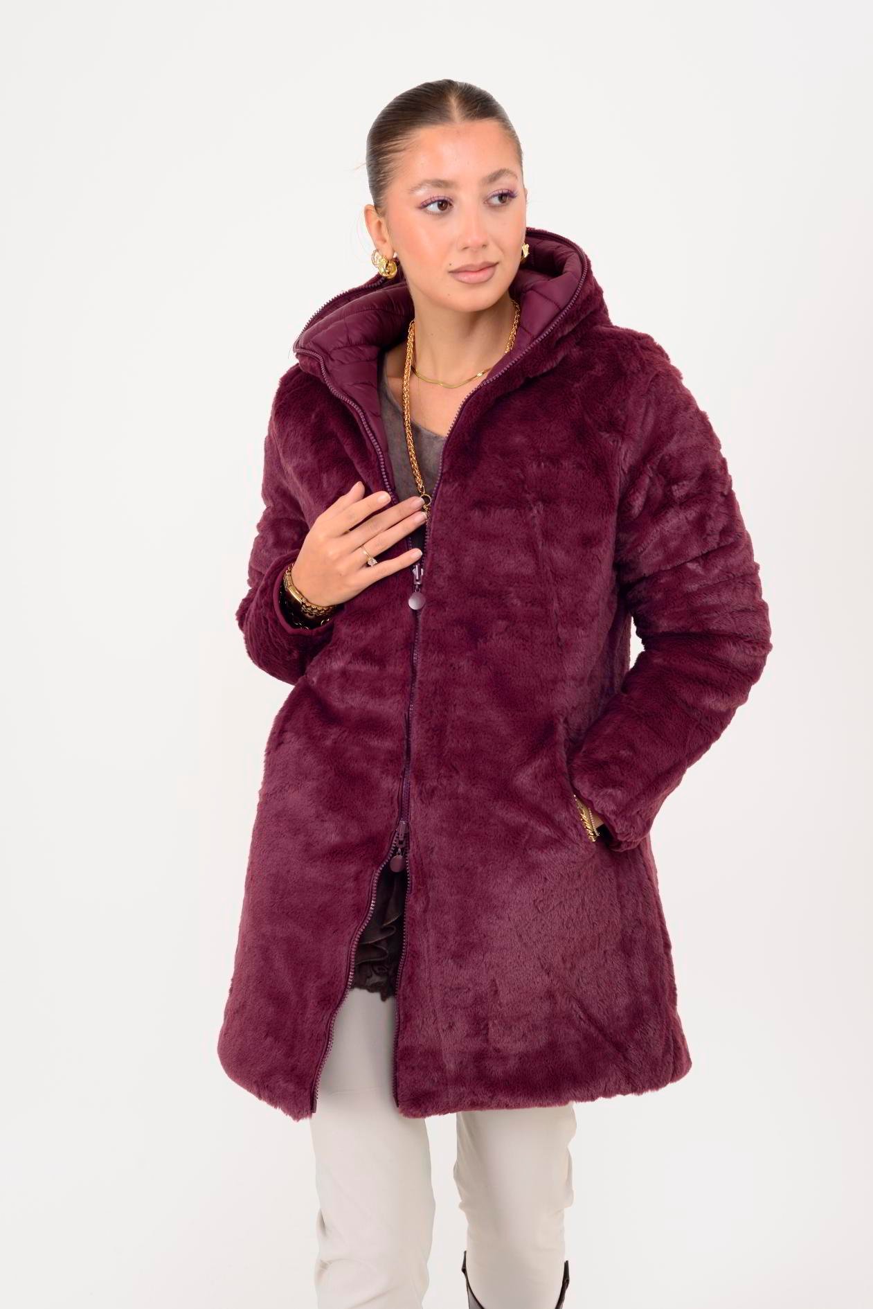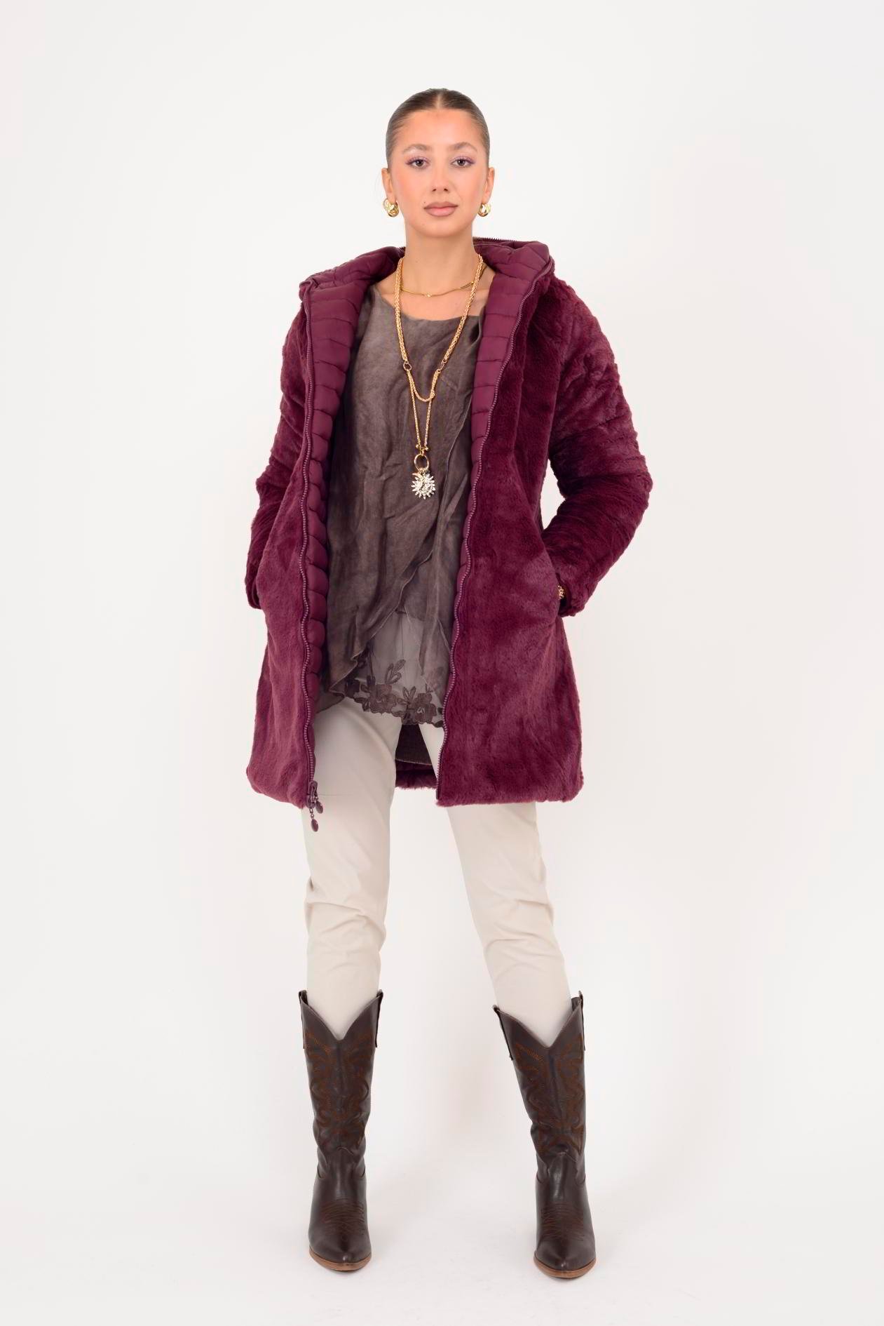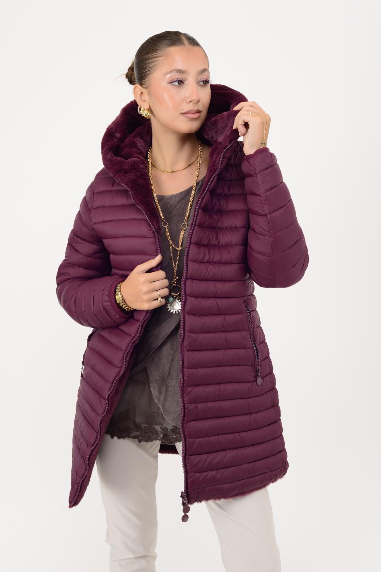Her iki yüzü de kullanılabilir. Çift taraflı tasarımı sayesinde farklı kombinlerle uyum sağlar. Geniş kalıptır. Kürk detaylı yüzeyi yumuşak peluş dokudadır; diğer yüzeyi ise şişme mont formundadır.